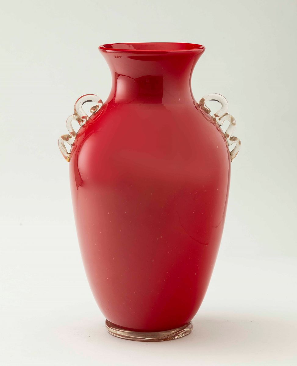 Vaso ad anfora in vetro incamiciato rosso con anse a serpente e piede applicati in vetro cristallo oro