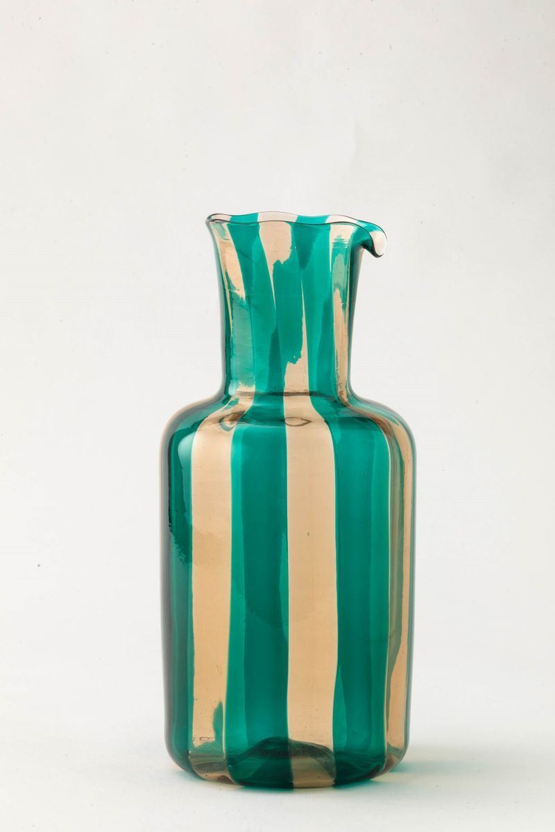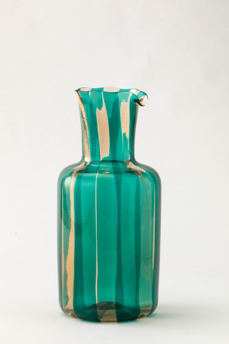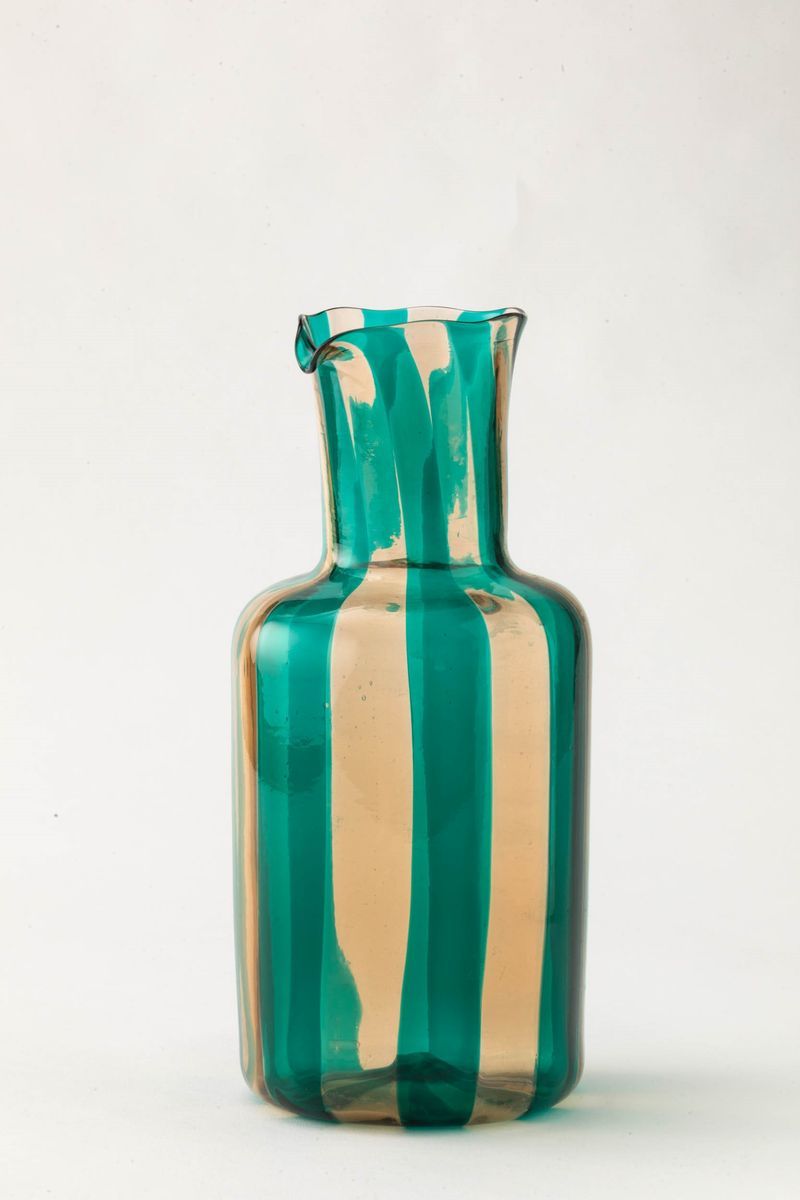 Caraffa cilindrica con alto collo in vetro soffiato con decoro di canne verdi e paglierine verticali