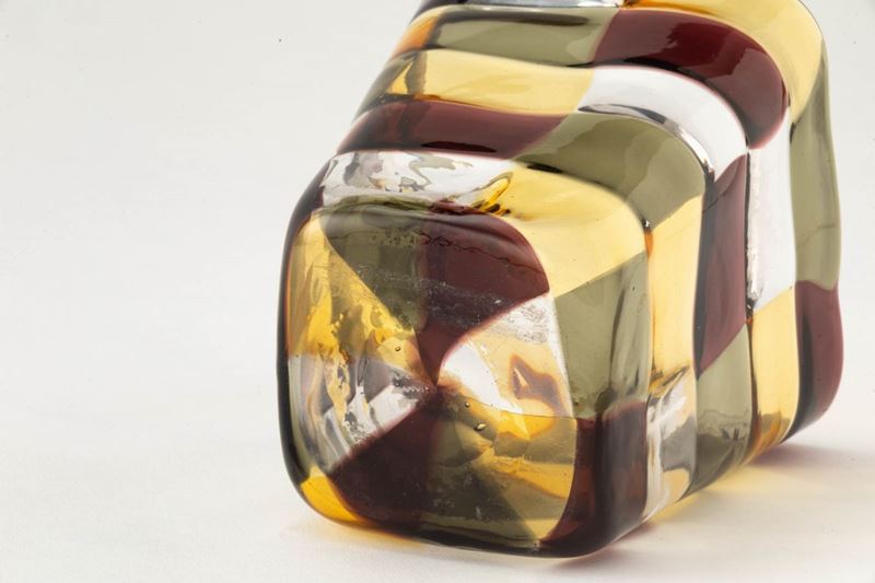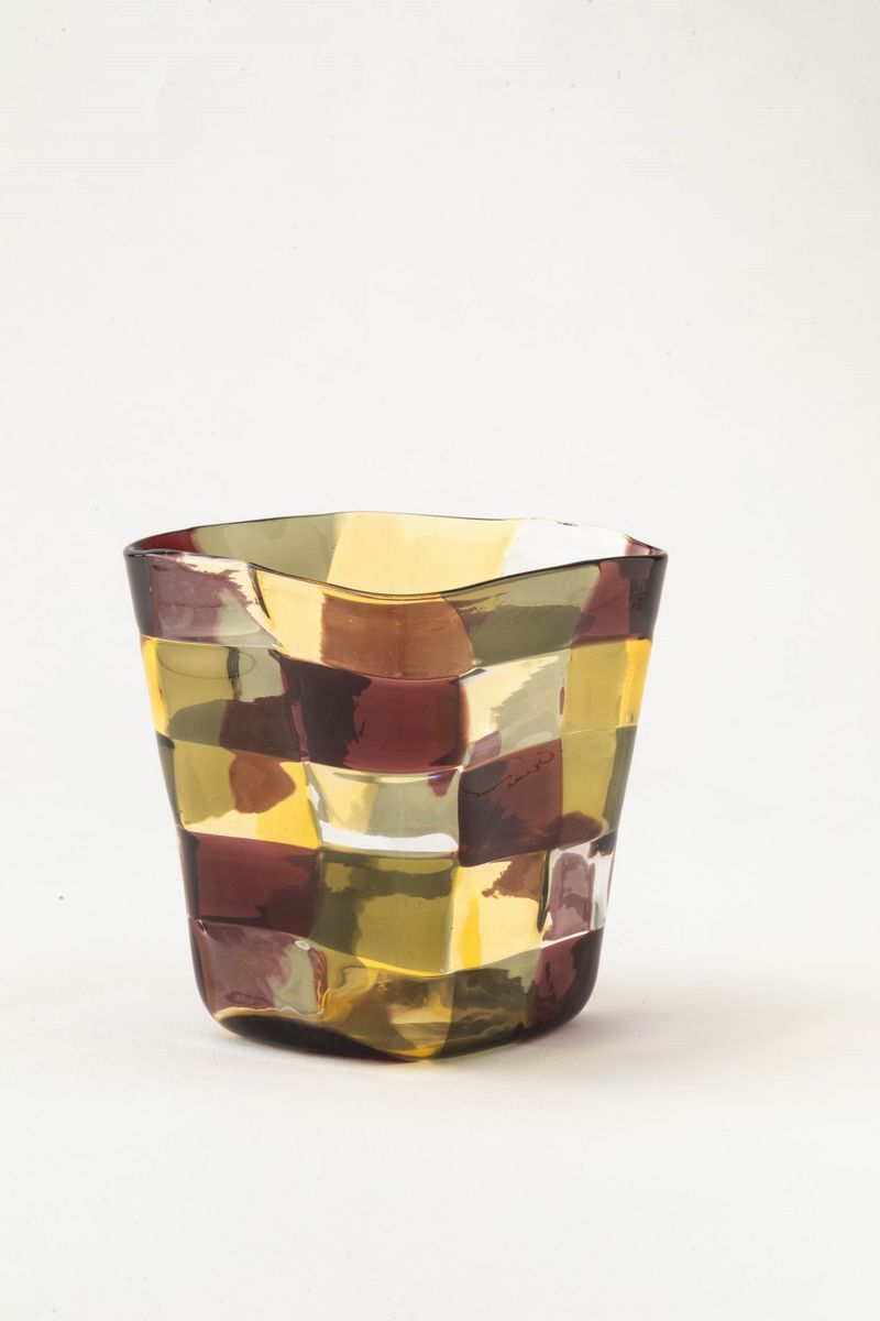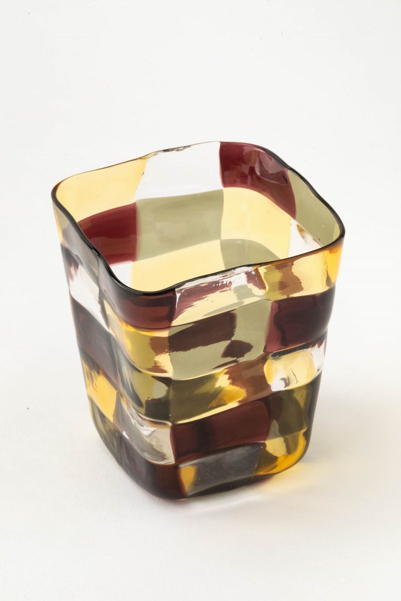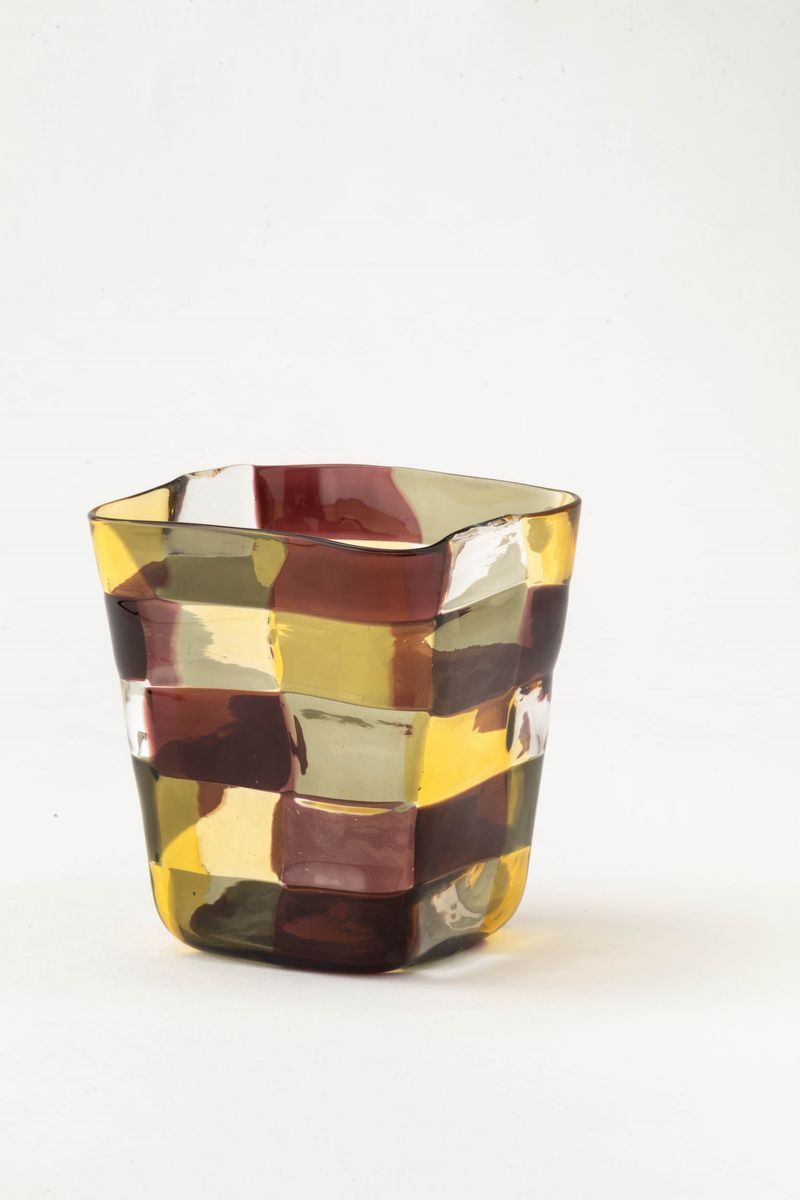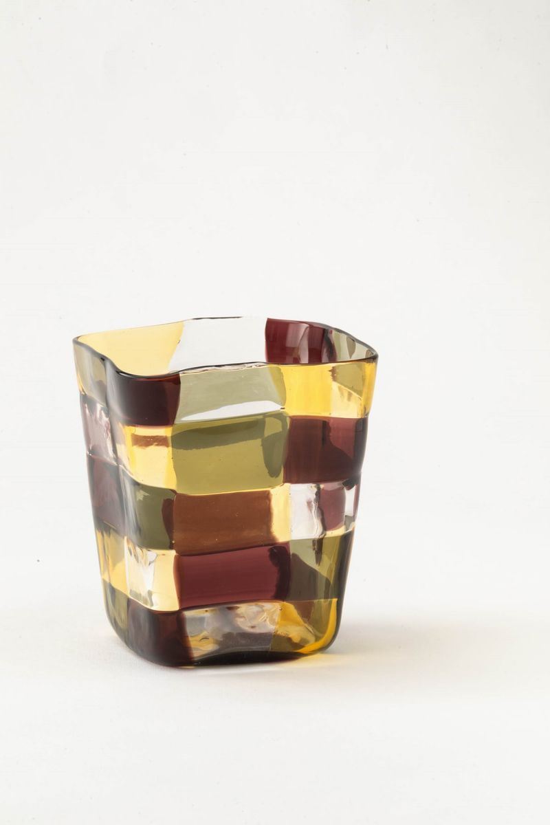 Vaso troncopiramidale serie Pezzati in vetro soffiato con decoro di tessere multicolori nella variante Istanbul