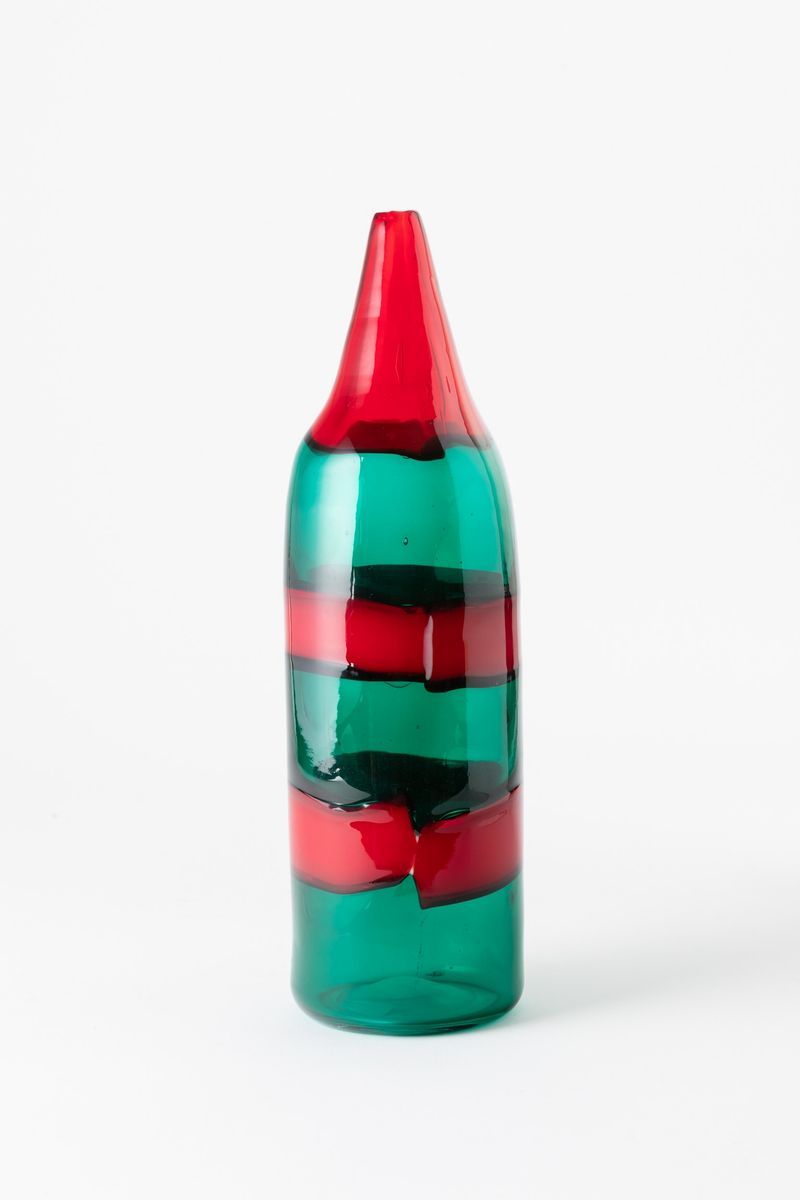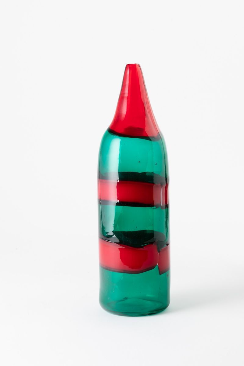 Raro vaso a bottiglia con collo conico in vetro soffiato verde con fasce in pasta rubino