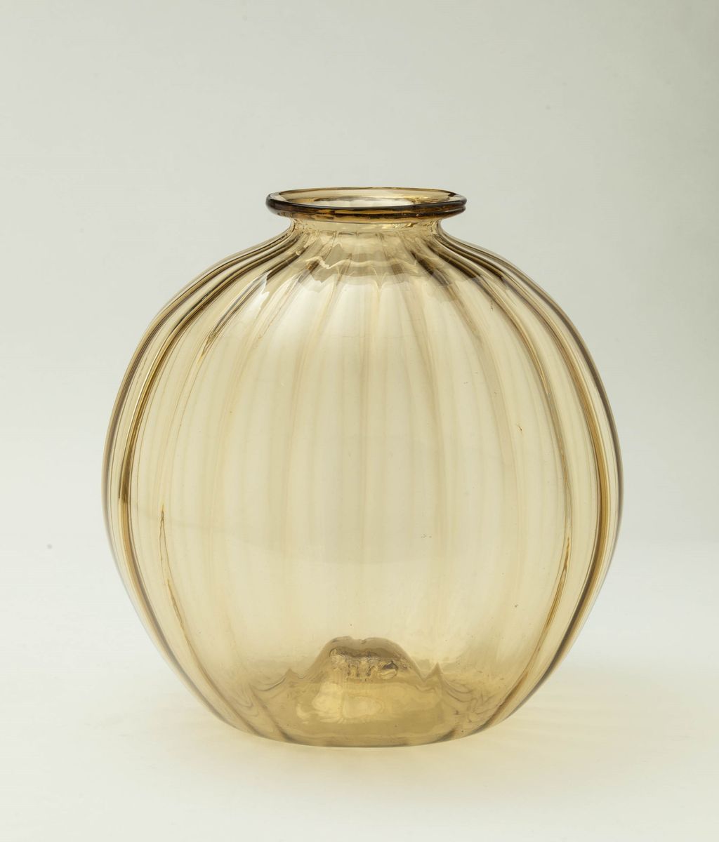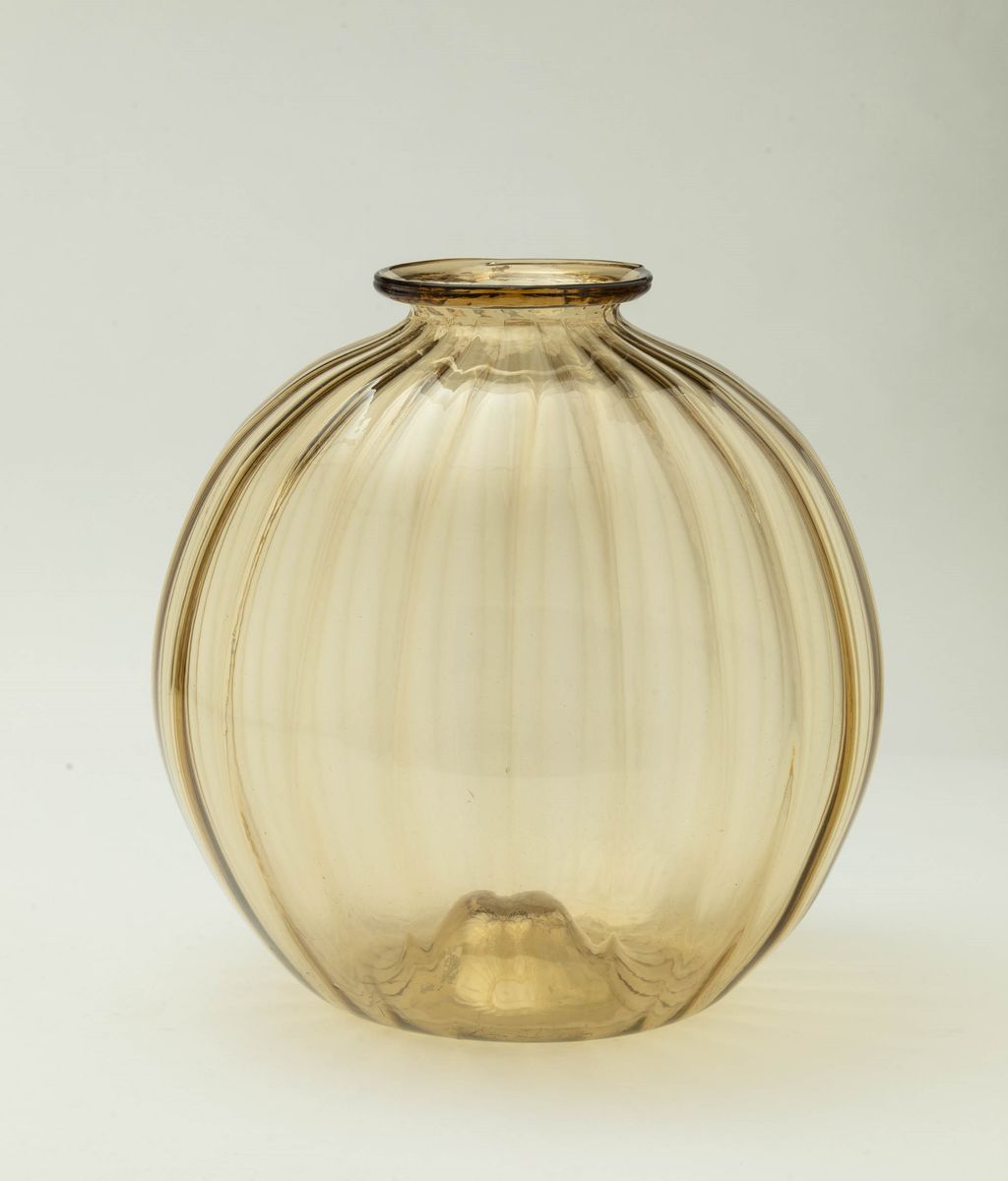 Grande vaso a sfera costolata in vetro soffiato paglierino con collo applicato