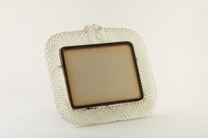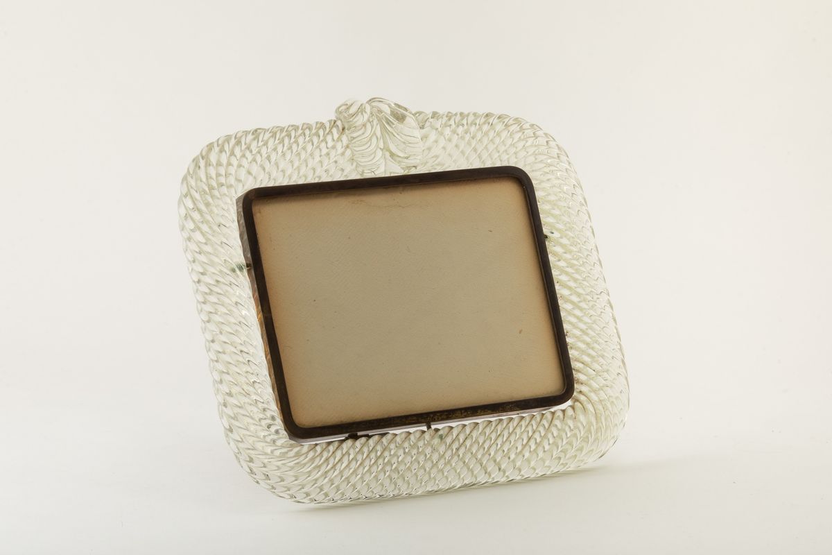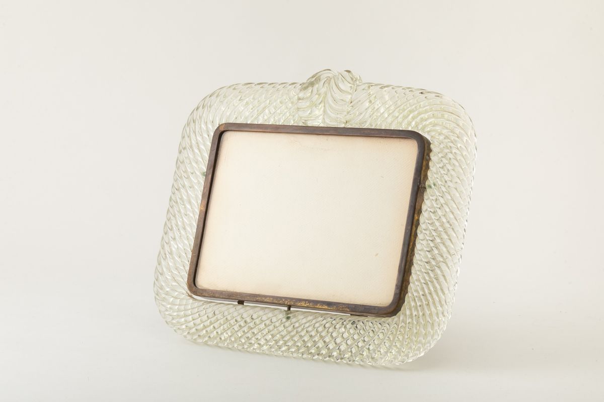 Cornice portaritratti in vetro a torciglione con decoro di cartella in forma di foglia e struttura in ottone