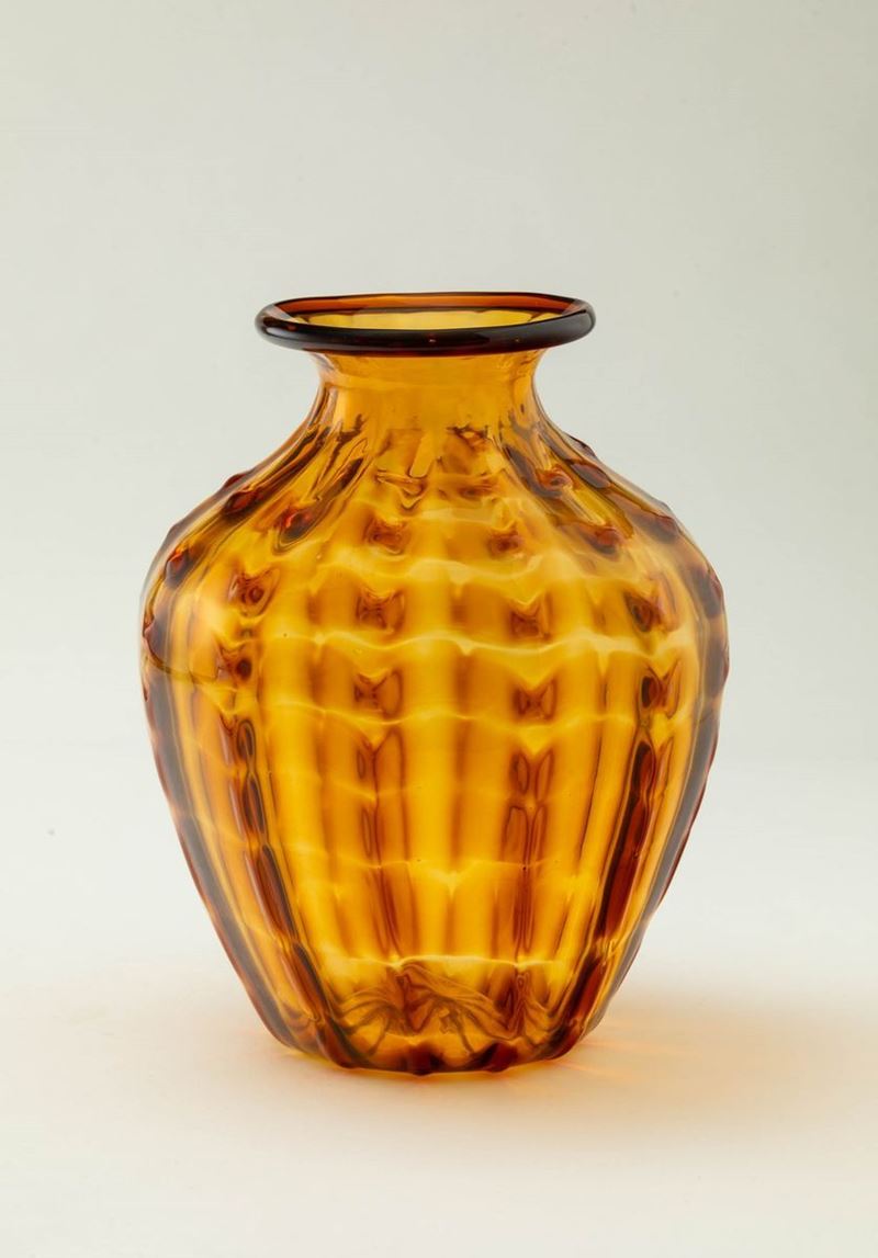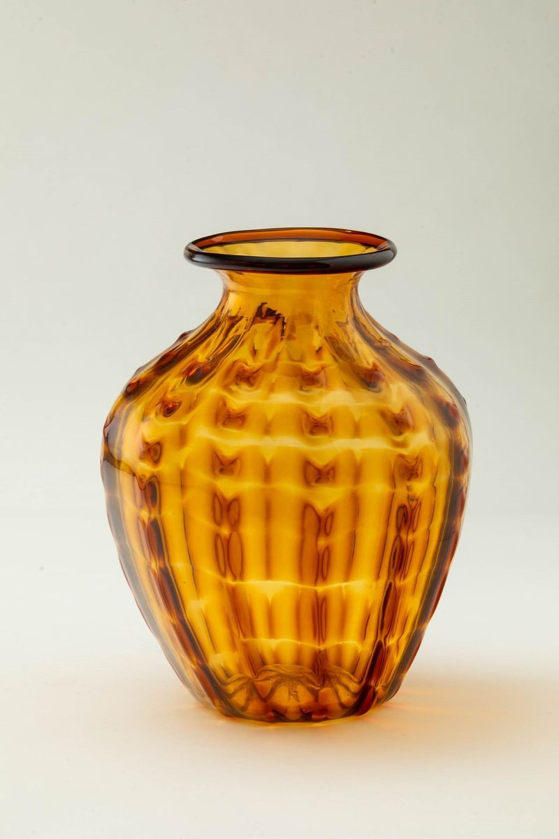 Vaso ad anfora in vetro soffiato paglierino con applicazioni di costolature in vetro ruggine segmentate