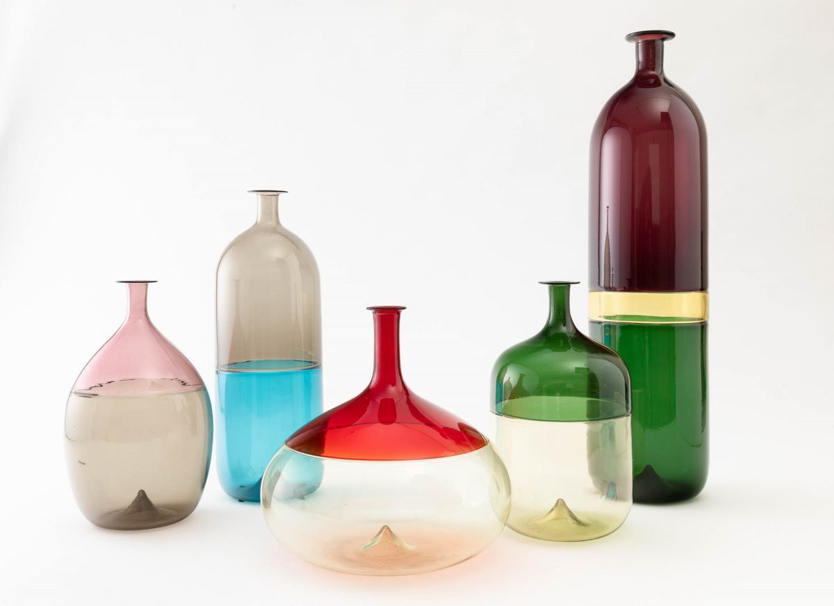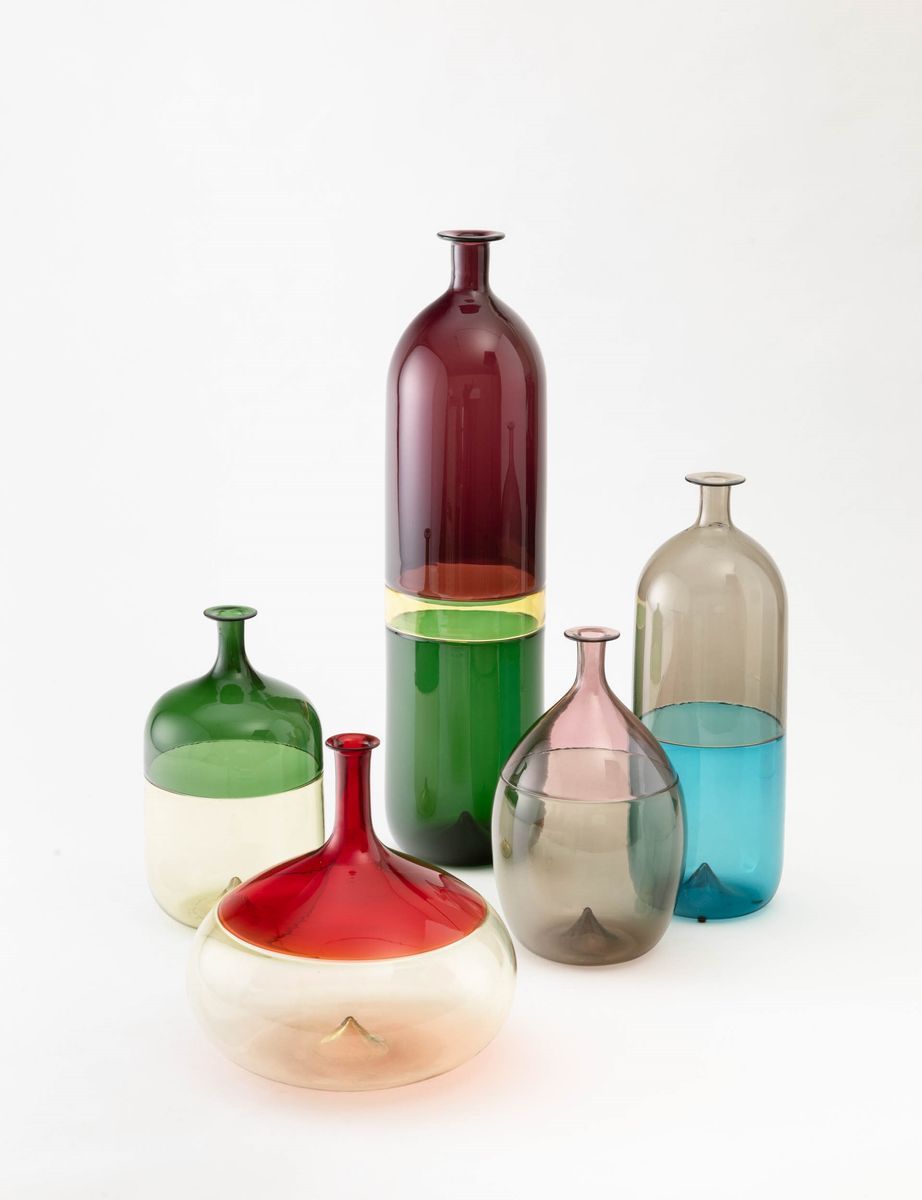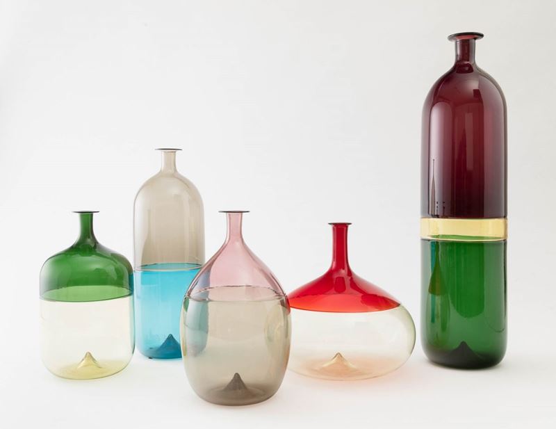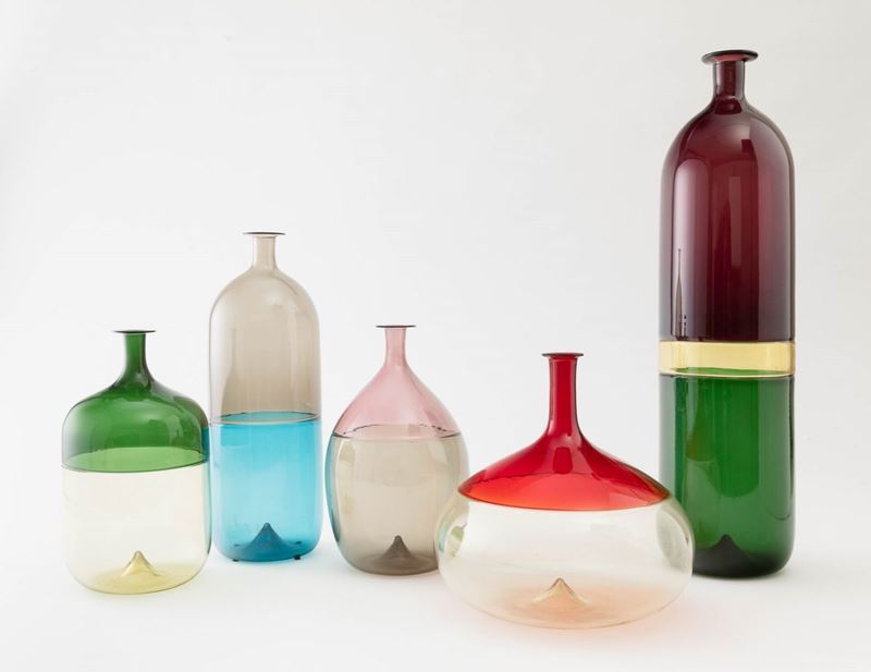 Lotto composto da cinque bottiglie serie Bolle in vetro soffiato a incalmo