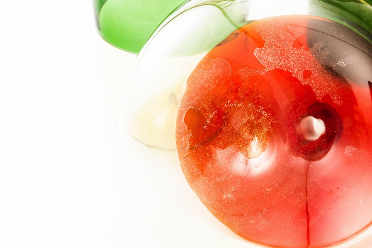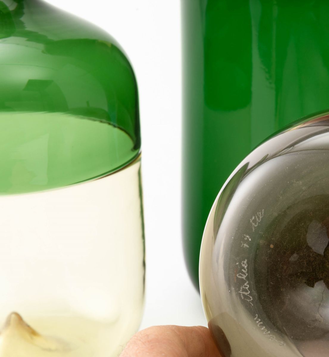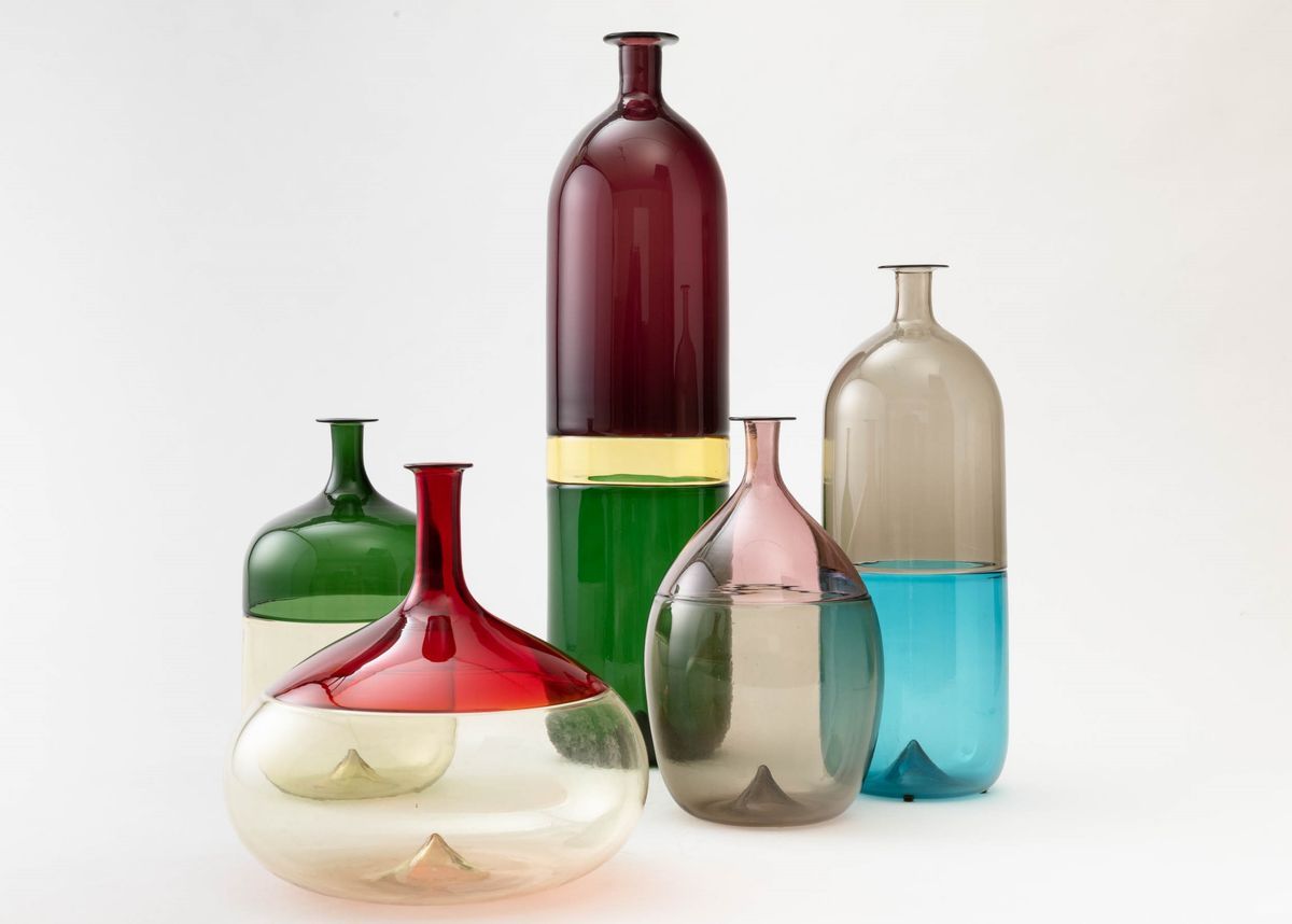 Lotto composto da cinque bottiglie serie Bolle in vetro soffiato a incalmo
