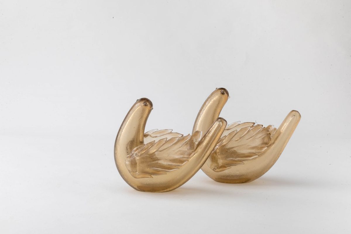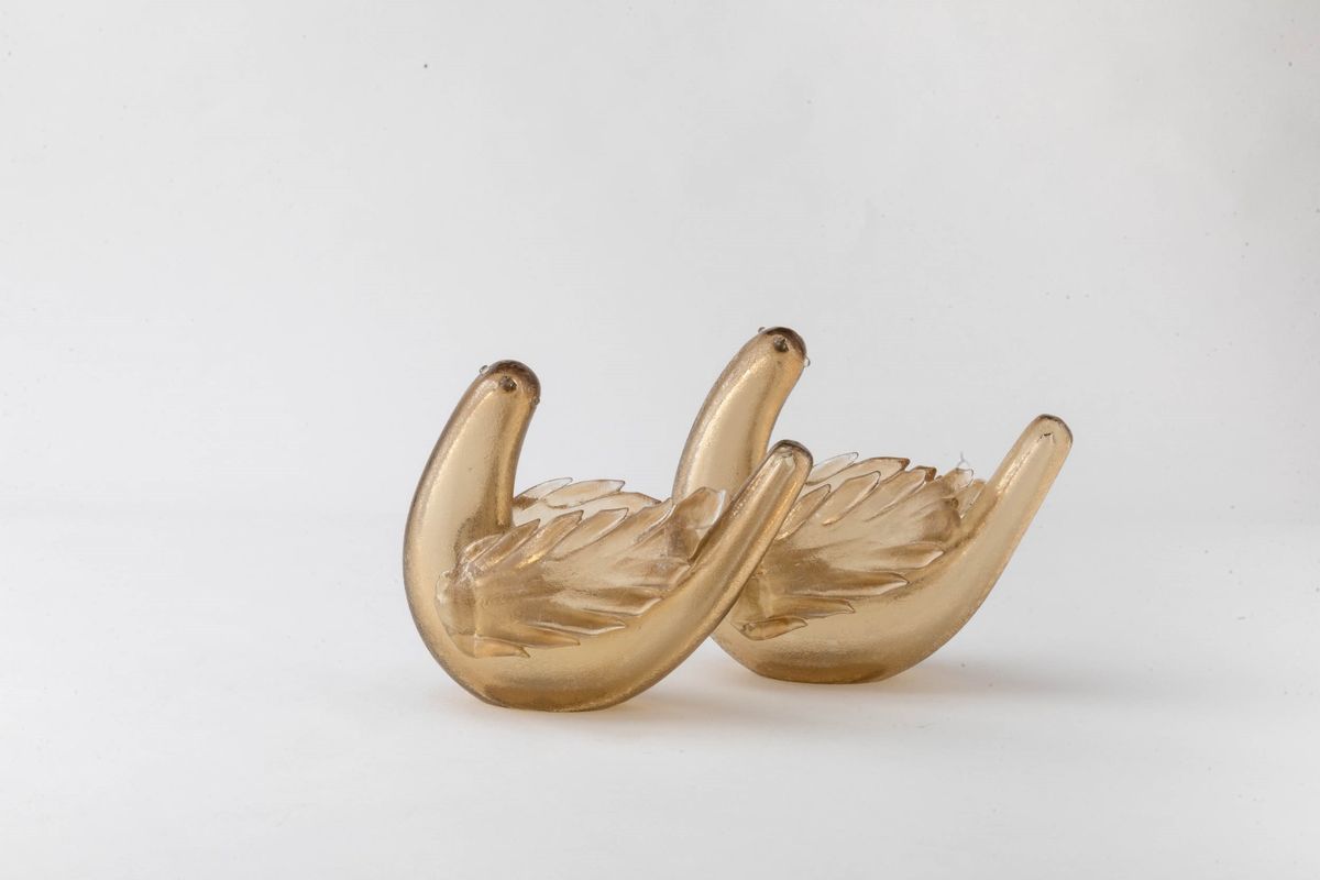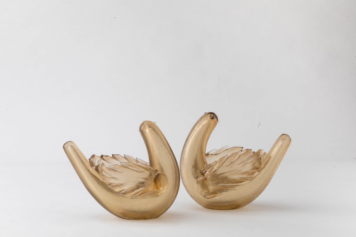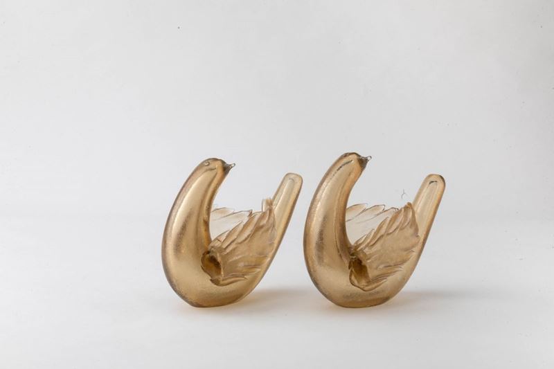 Coppia di colombe in vetro pesante paglierino con superficie interamente corrosa