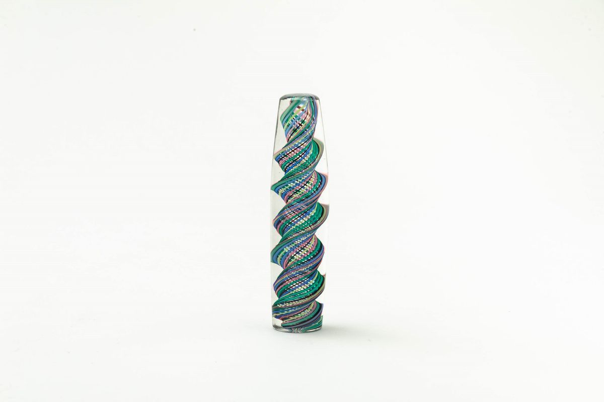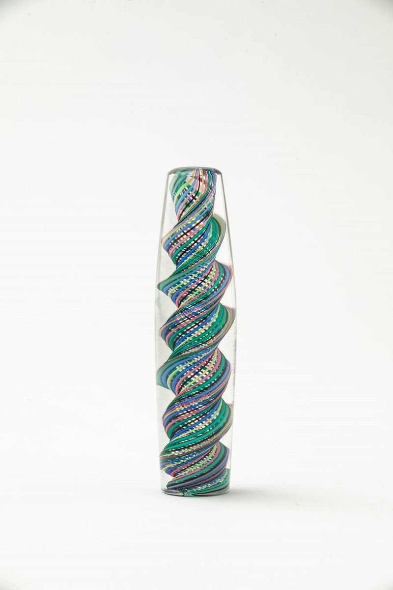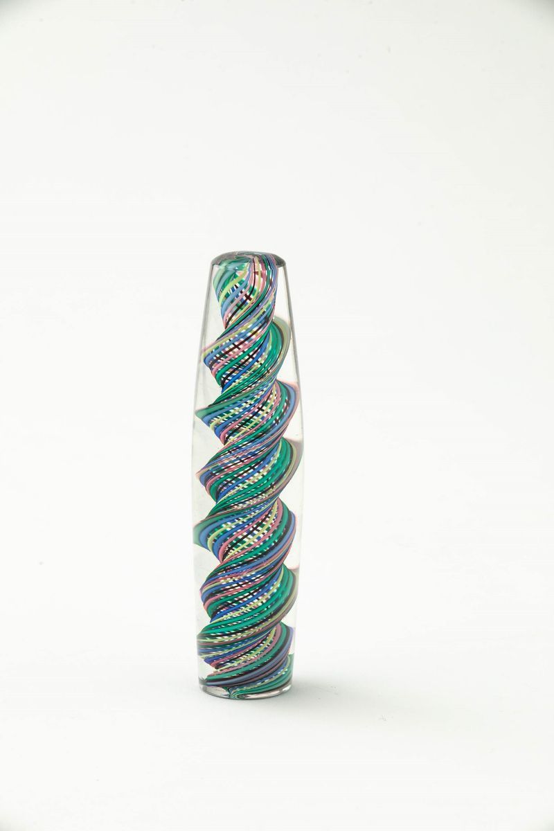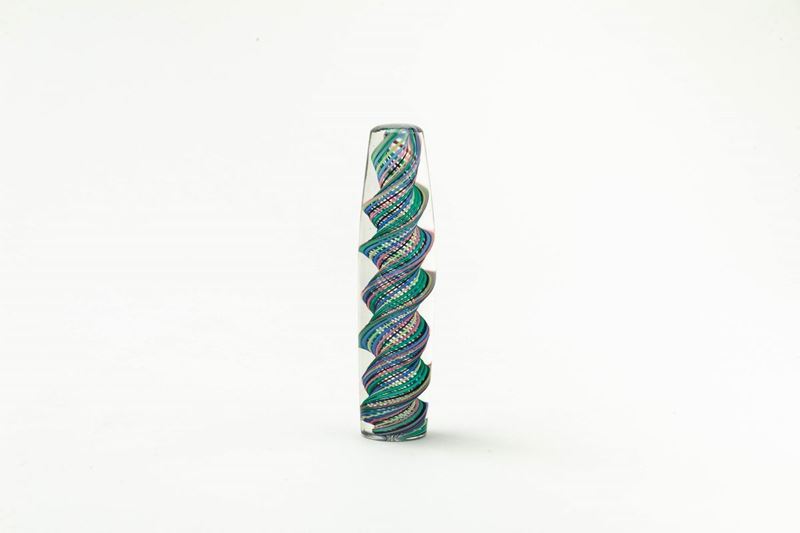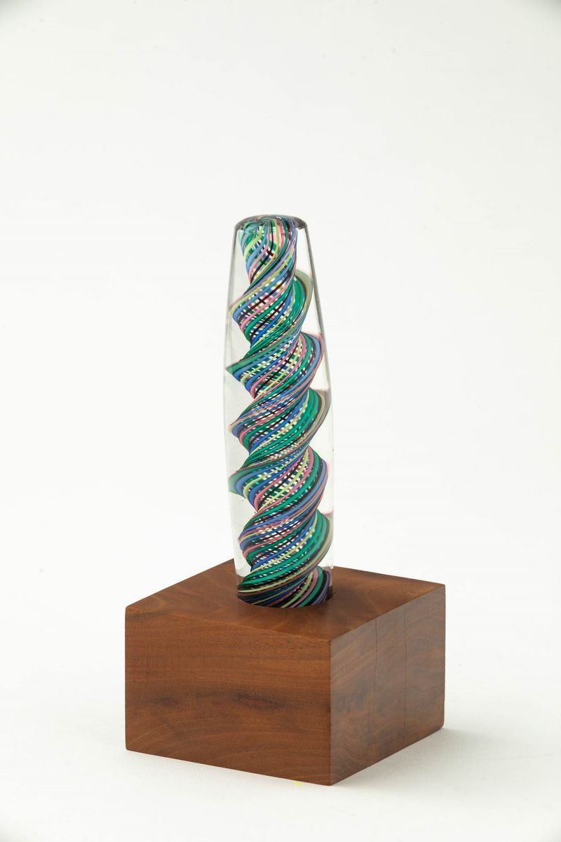 Piccolo obelisco in vetro pesante con decoro di canne policrome sommerse. Base in legno