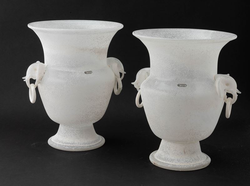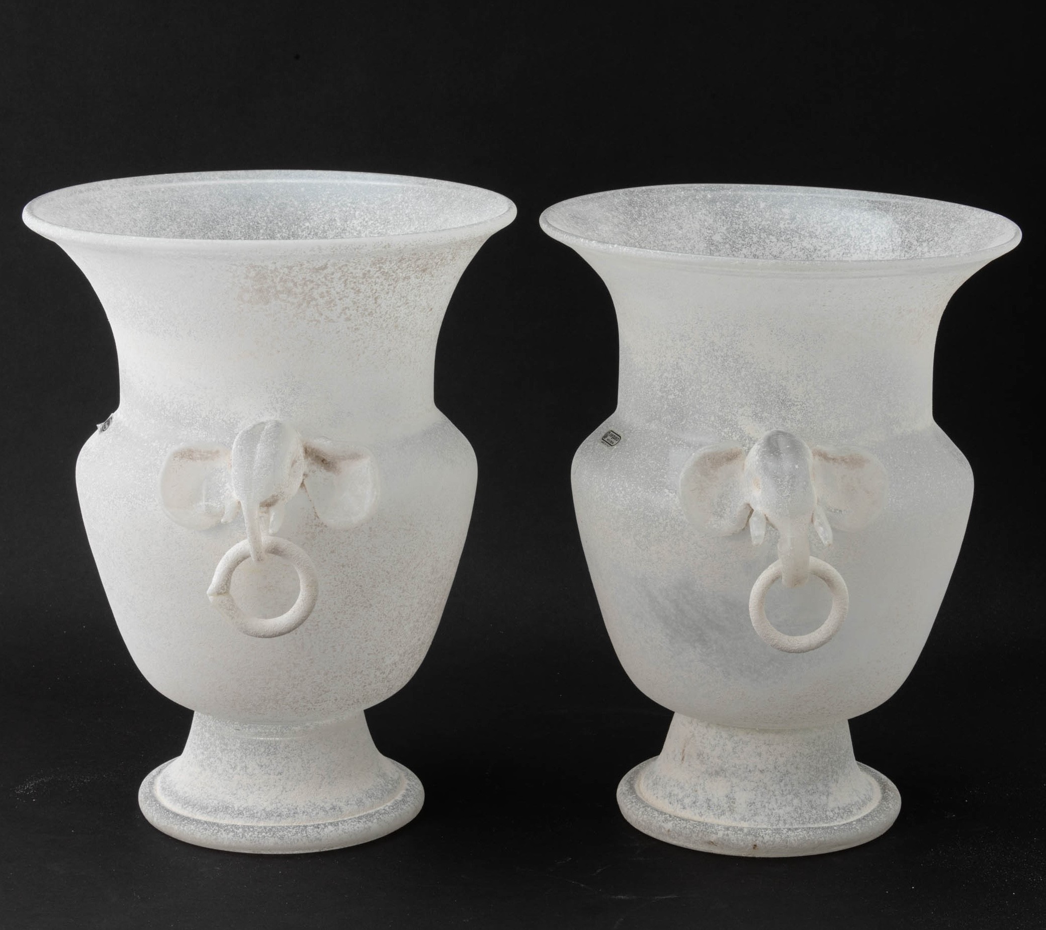 Coppia di vasi a cratere in vetro a tecnica scavo con teste elefantine applicate che reggono anelli