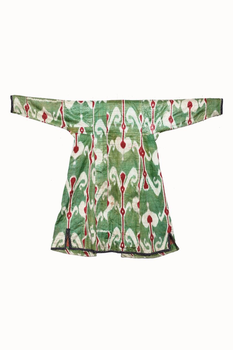 tipica sopravveste centro asiatica questo esemplare è in seta verde. Interno in cotone, bordino blu.