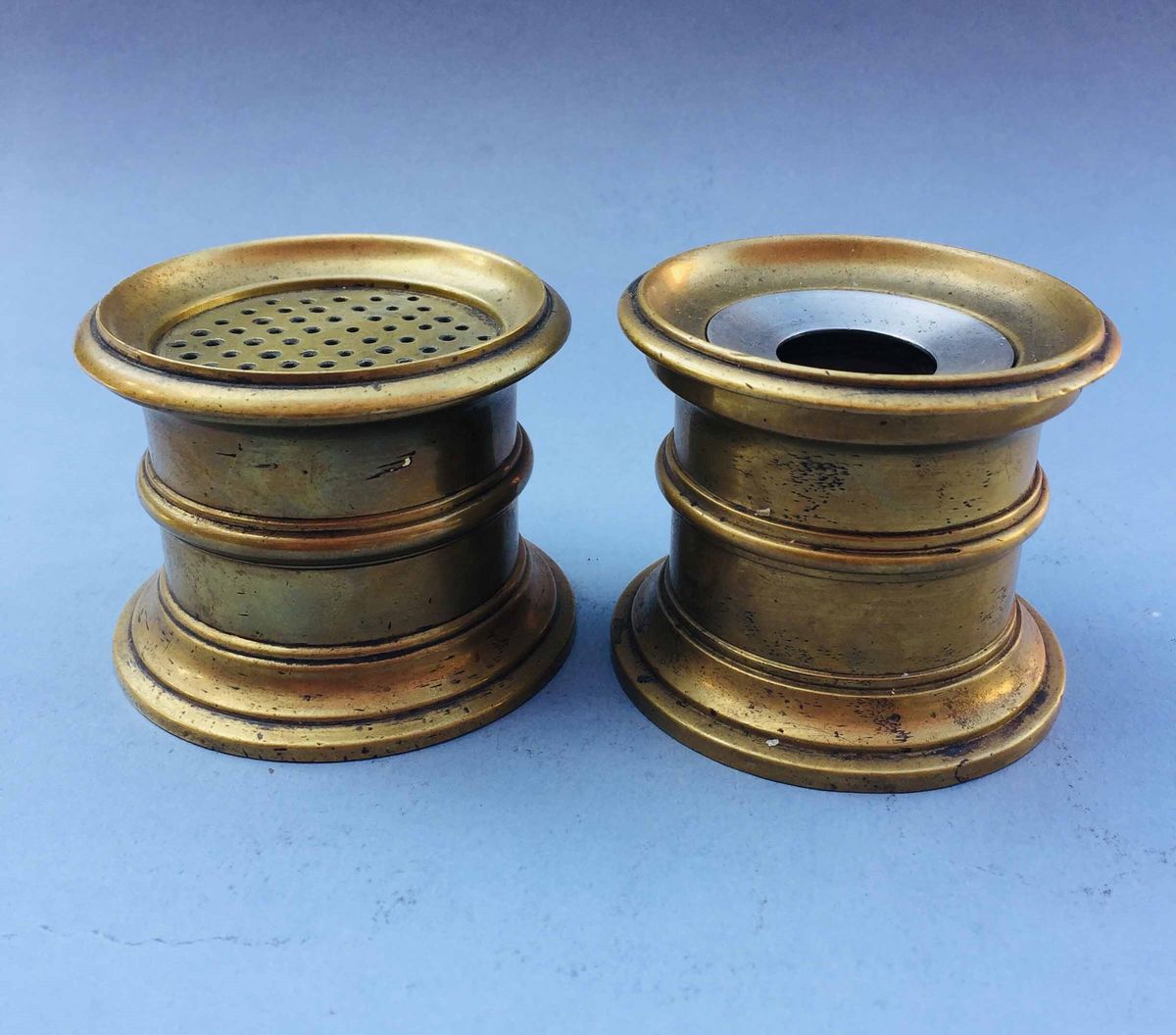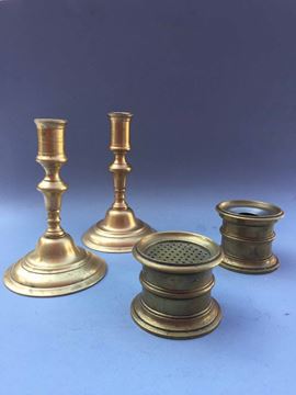 composto da una coppia di candelieri del 600/700 da un antico calamaio e relativo spargipolvere Candelieri altezza cm 16, base cm 10,5
