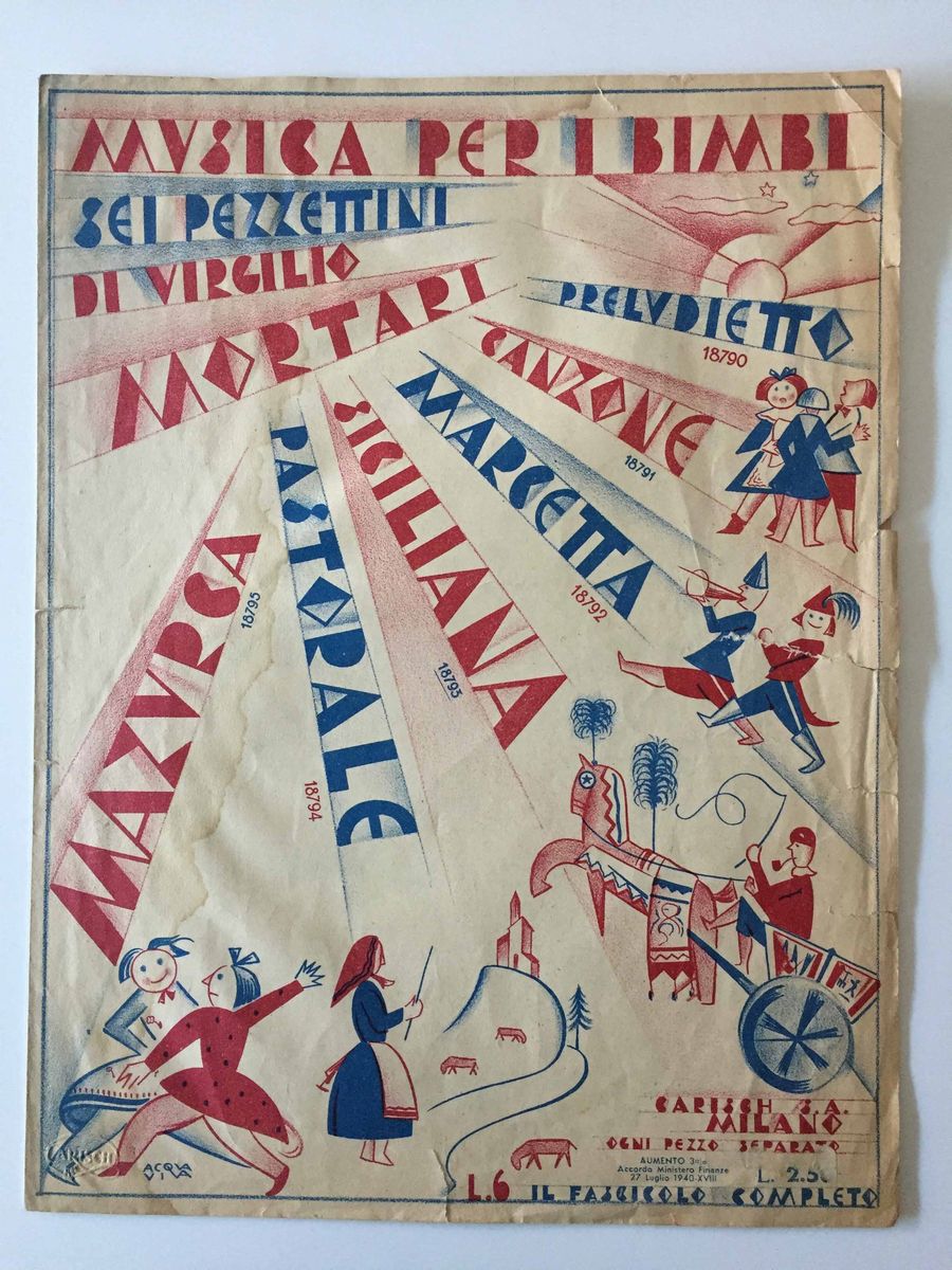 rivista del 20 Febbraio 1929, VII Copertina firmata F. Depero Rovereto Con 40 pagine dedicate all’evento della Conciliazione. Si aggiunge di GIOVANNI ACQUAVIVA, la copertina in stile futurista di uno spartito di musiche per bambini di Virgilio Mortari