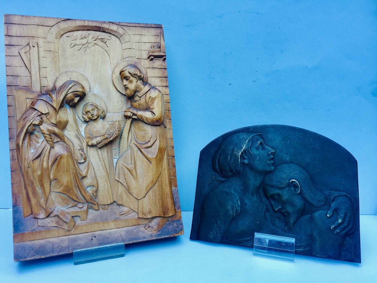 Un bassorilievo in bronzo, fine 800, primi 900 Cm 21 x 17; un altorilievo in legno, anni 50, raffigurante la Sacra Famiglia. Cm 29,5 x 20,5
