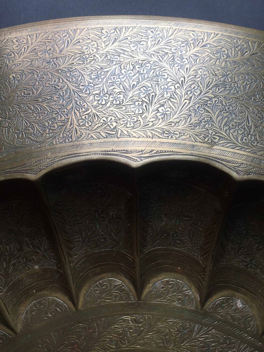 In ottone, superficie interamente incisa a mano con motivi floreali con al centro la raffigurazione del Taj Mahal Diametro cm 58
