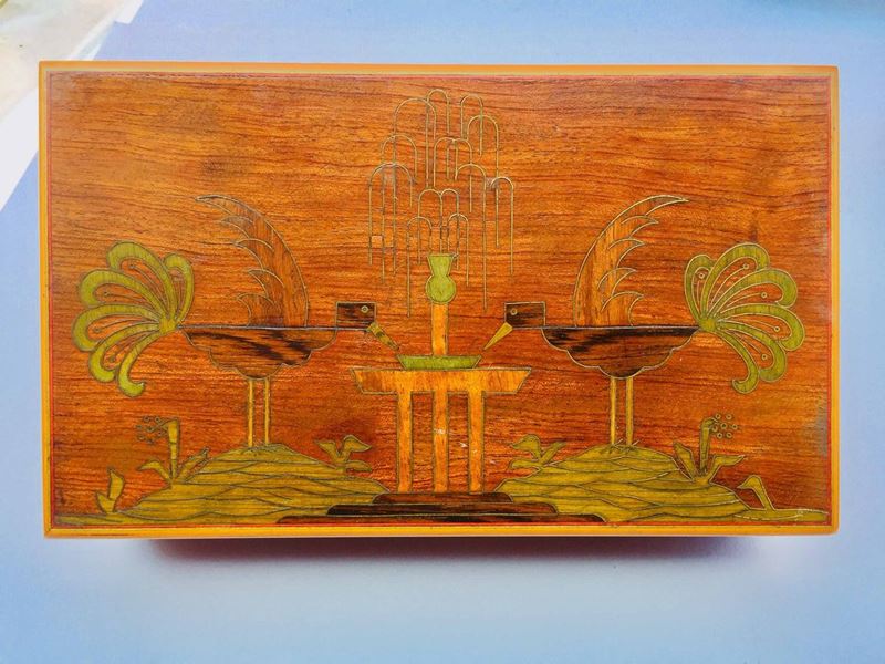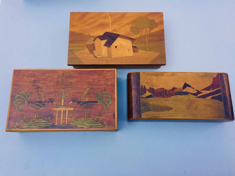 intarsiate con legni diversi, una decorata con uccelli stilizzati che si abbeverano a una fontana (legni colorati e inserti in ottone ), altra intarsiata e dipinta con scena galante ecc Misure diverse. La più grande lunga cm 32, la più piccola cm 21, 2