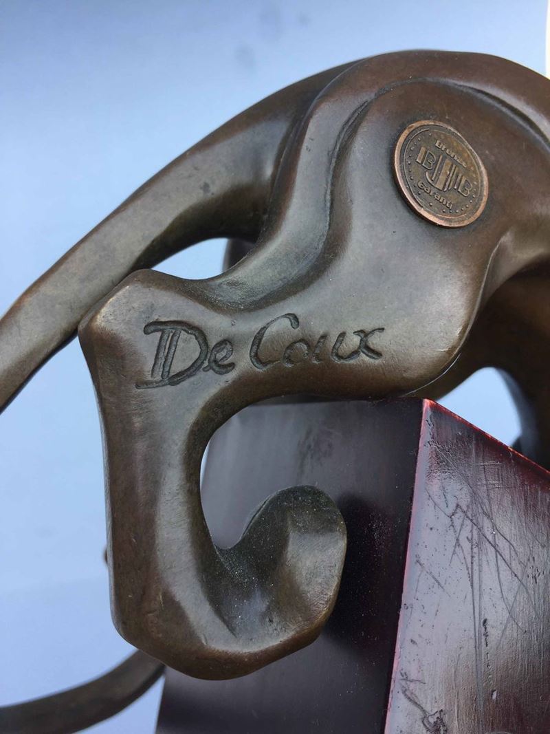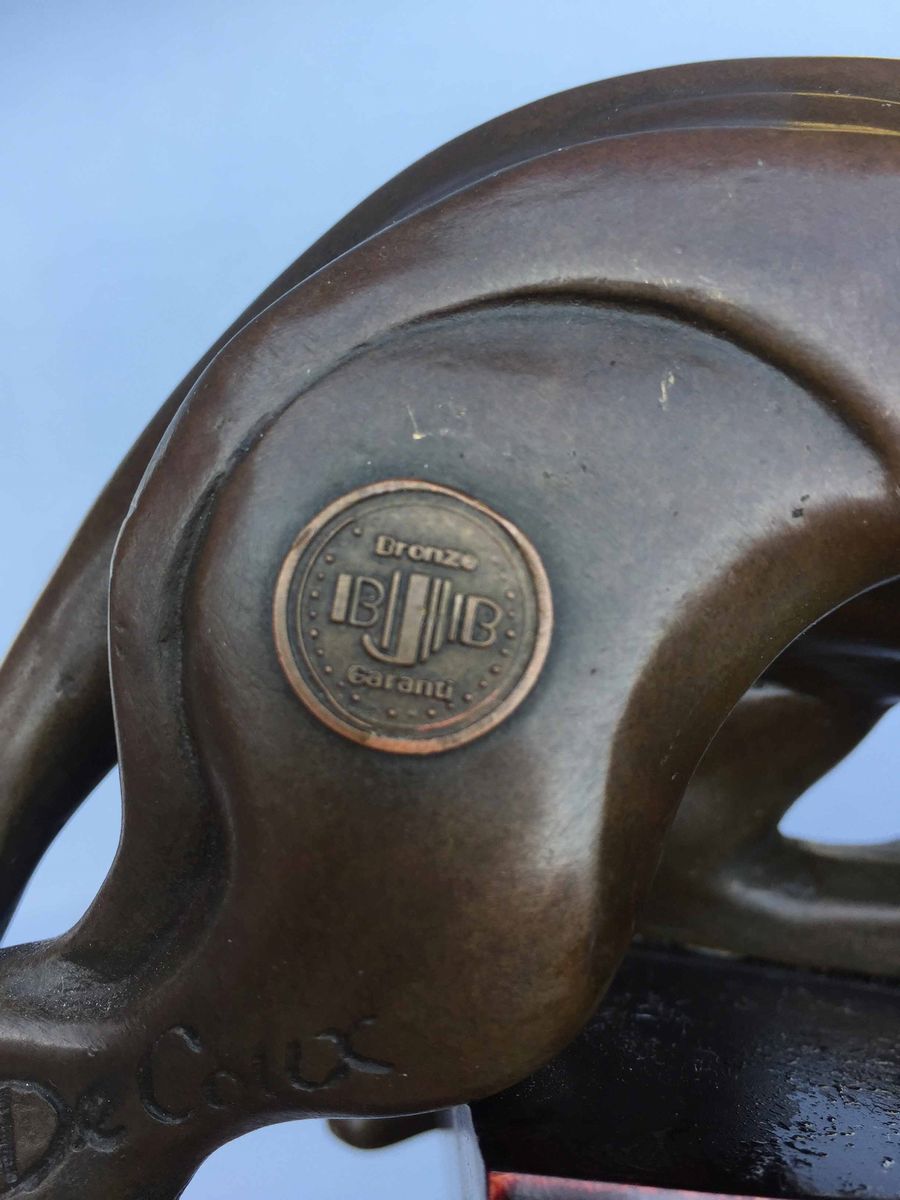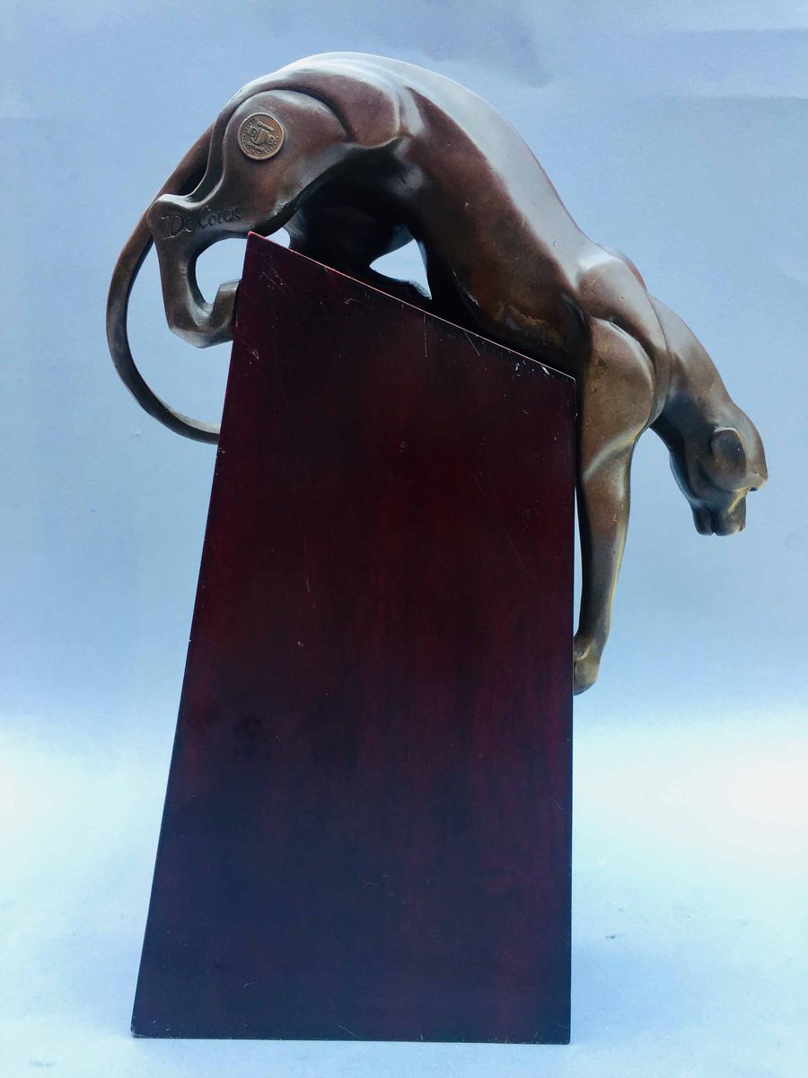 "Pantera" in bronzo su base in legno di color rosso scuro (mogano ?) Altezza cm 34,2; profondità cm 24 Firma incussa DE COUX e, in rilievo, bollo di garanzia del fonditore XX° secolo