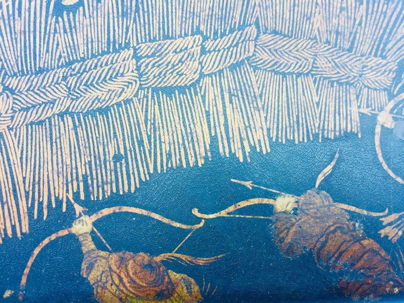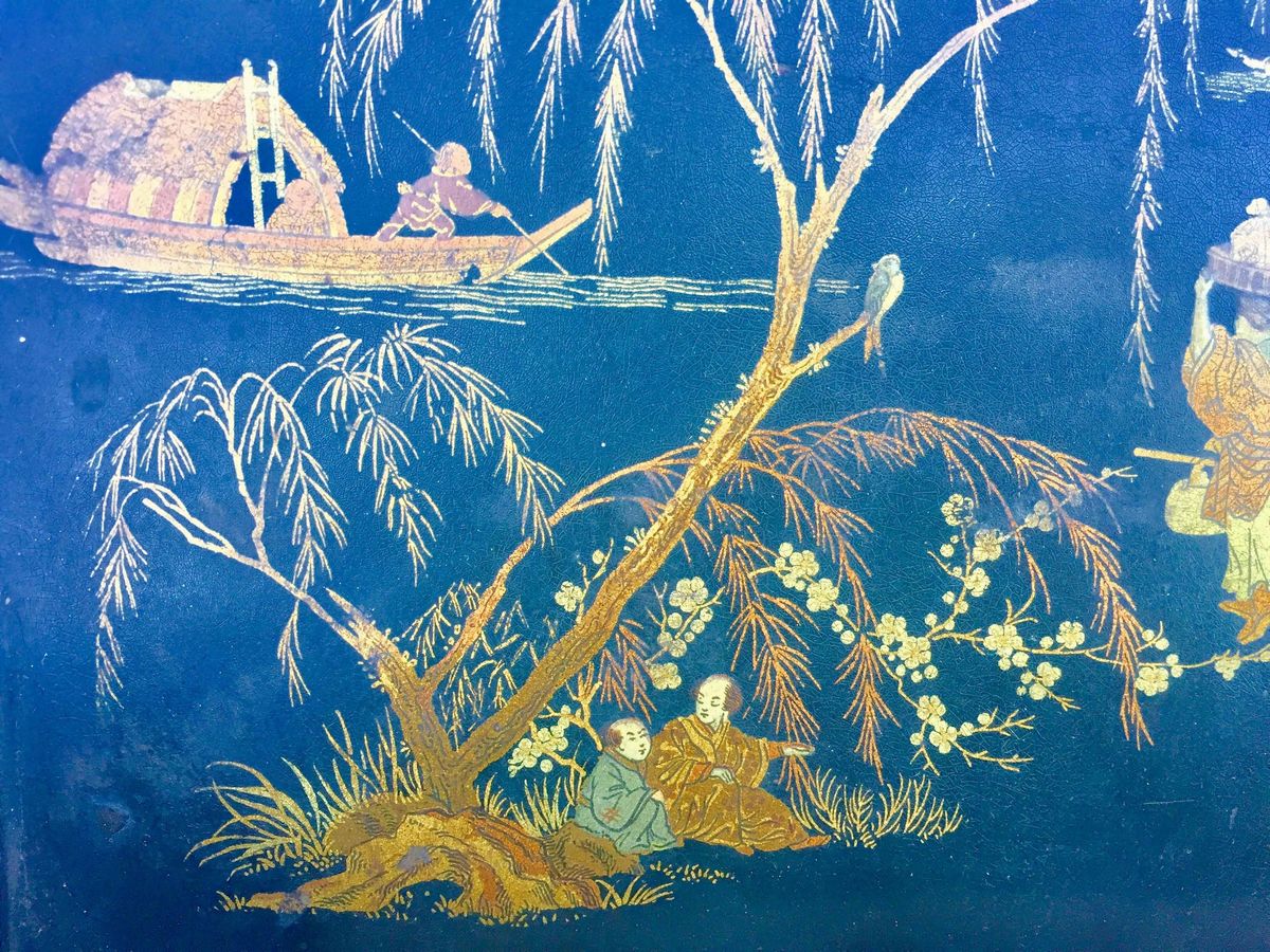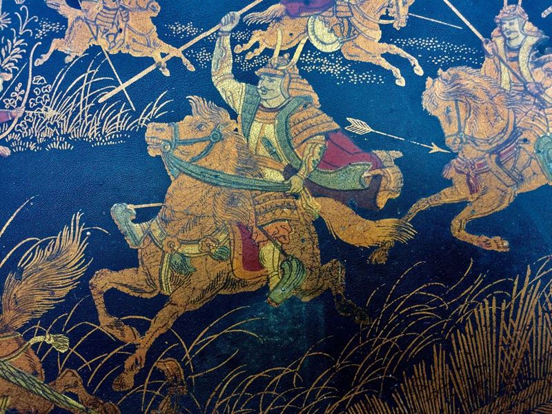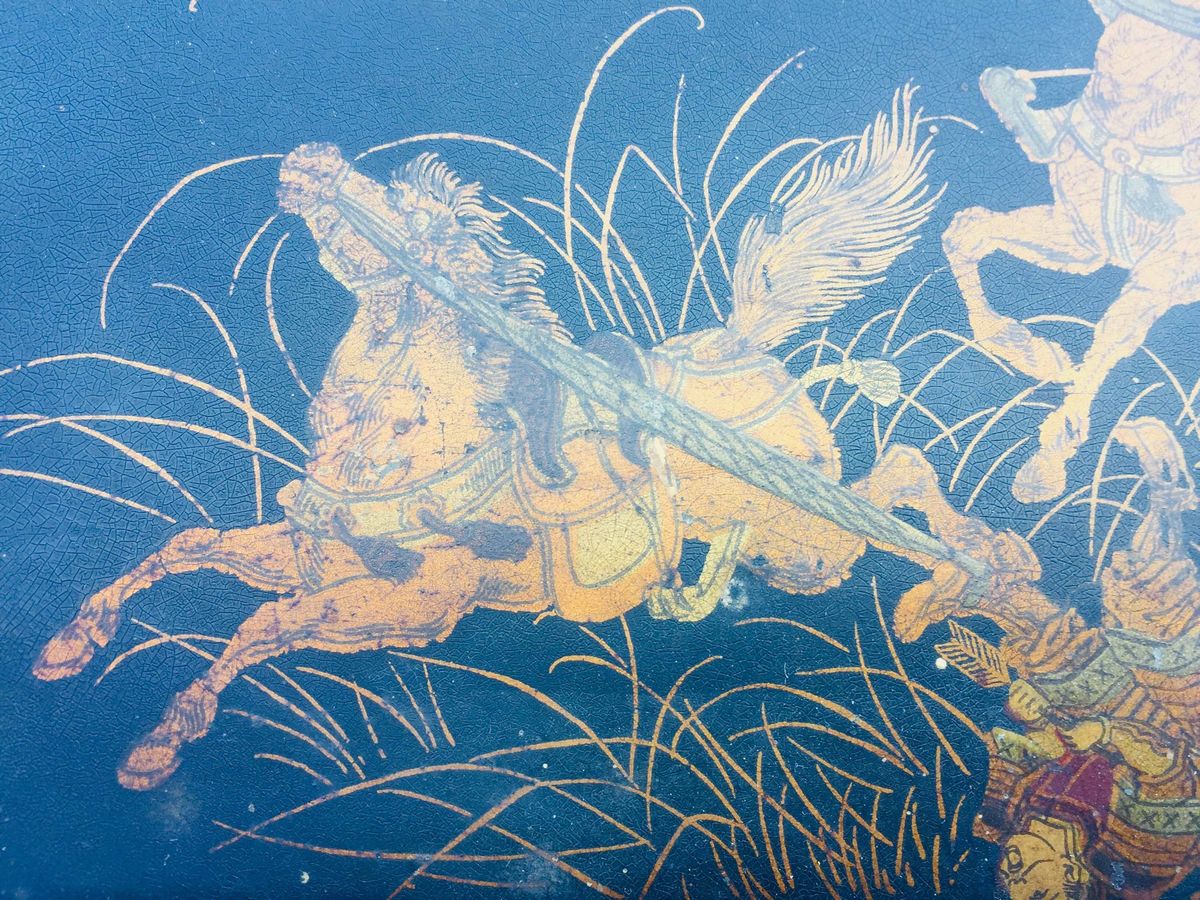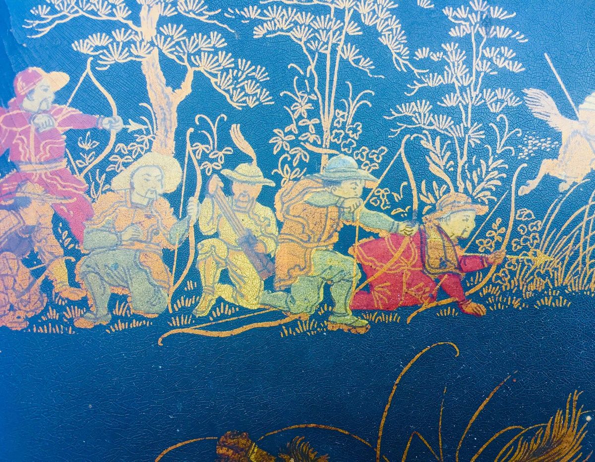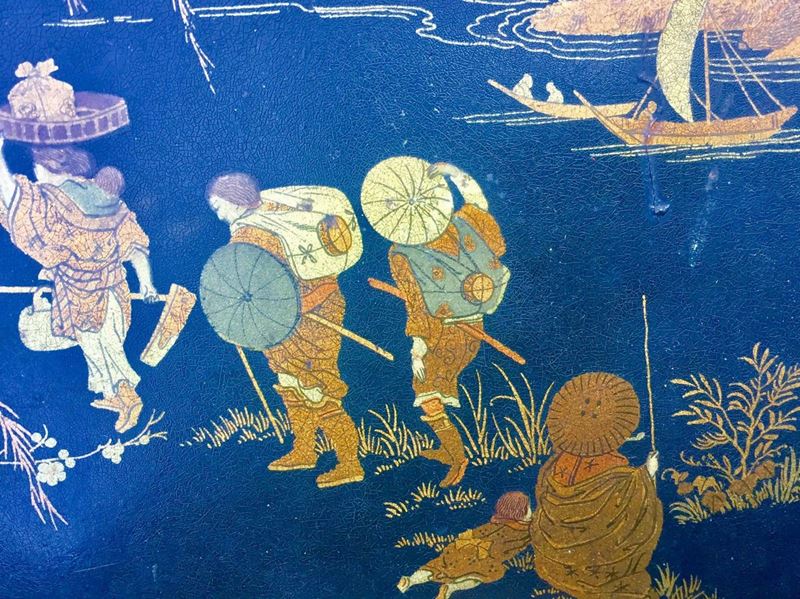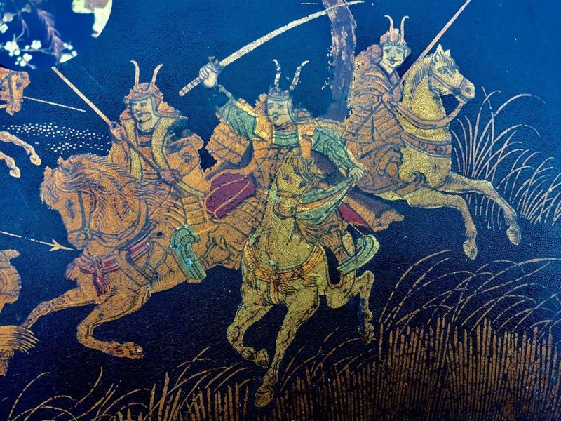 Raffigurante scene del Giappone in Pace e in Guerra. Altezza cm 33, larghezza cm 30,5 Una piccola antica mancanza sul bordo del lato destro che non intacca la parte decorata. Interessanti dettagli delle scene di guerra.