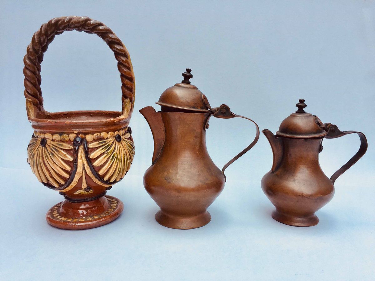uno scaldino in terraglia e due caffettiere in rame. Tutti d’epoca. Altezza scaldino cm 17; caffettiere cm 13 e cm 10