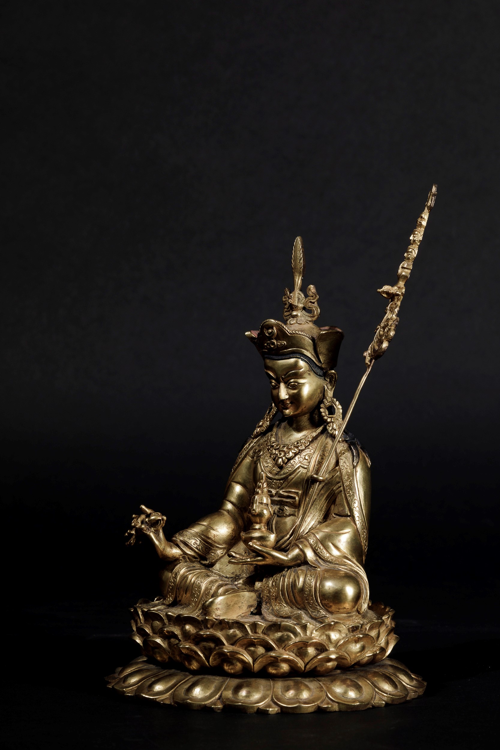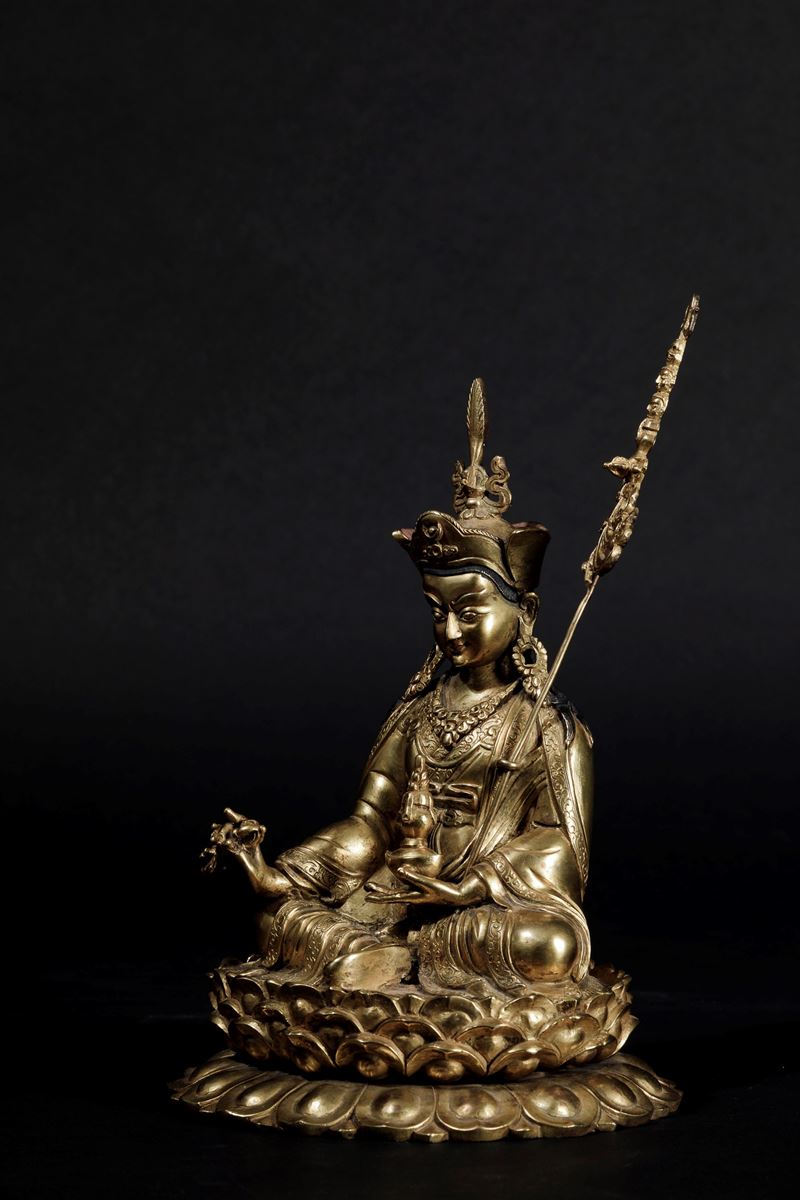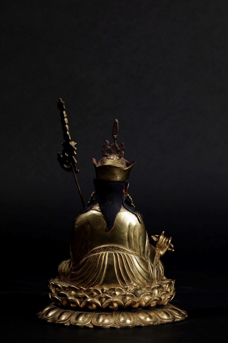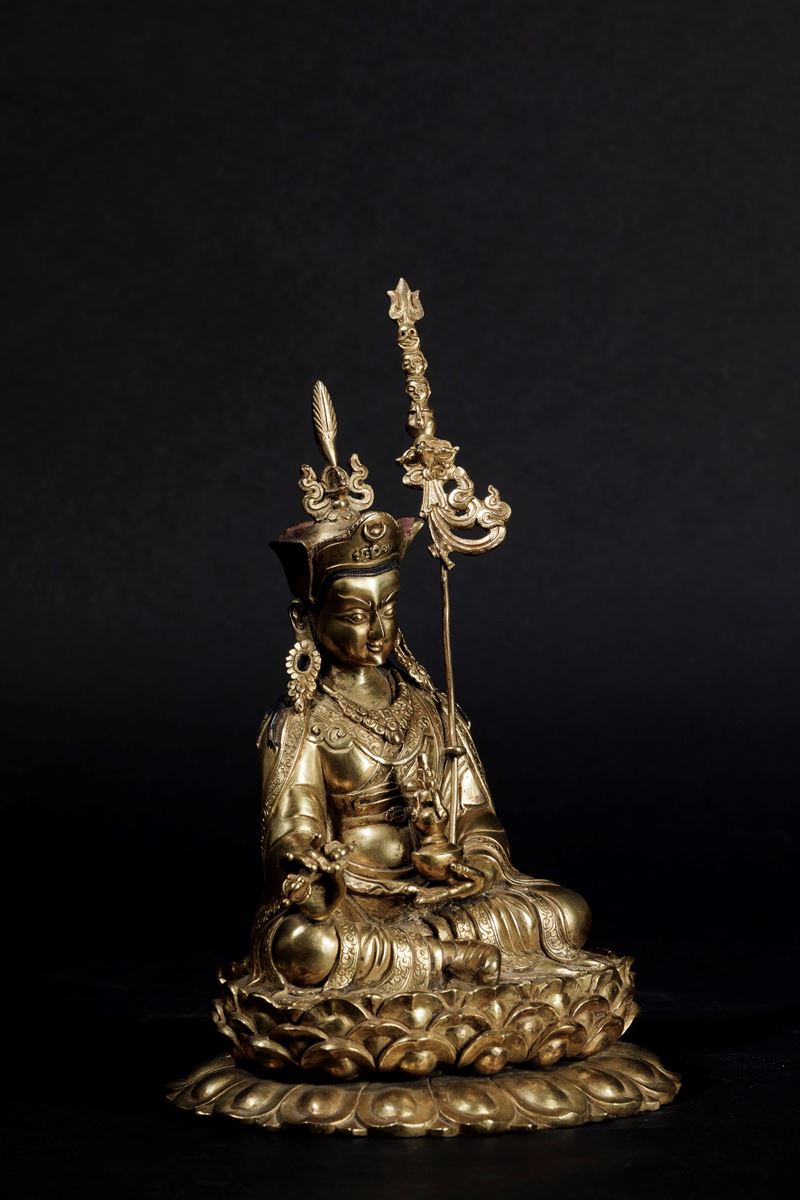Representation of the Lama with Vajra seated on a double lotus flower in gilded bronze with traces of polychromy. H 22cm