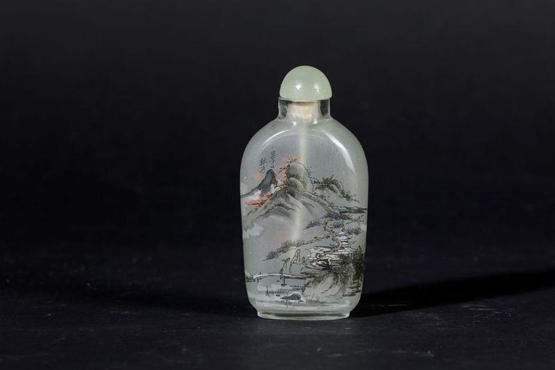 A glass snuff bottle with paintings depicting a mountain landscape with pagodas and an inscription. H 8.5cm