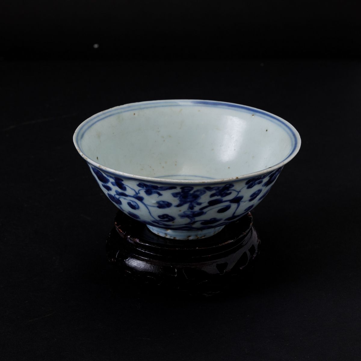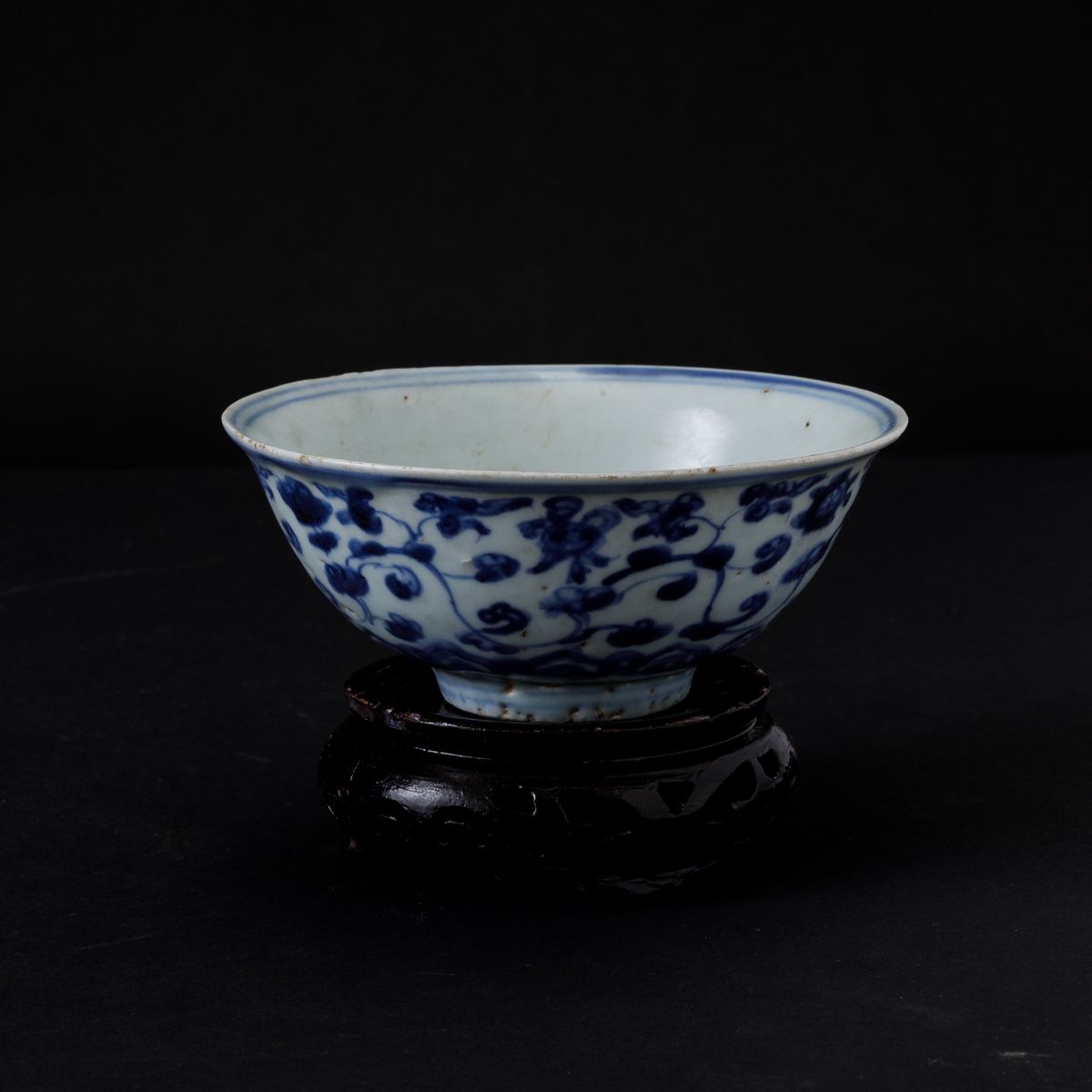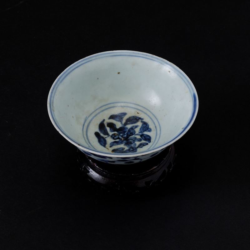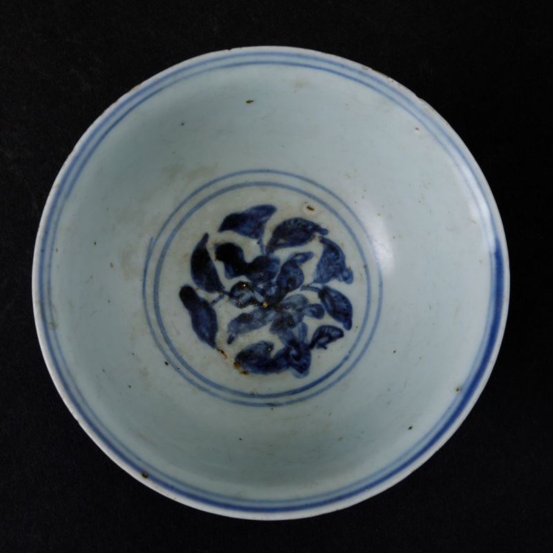 Ciotola in porcellana bianca e blu con decori floreali, Cina, Dinastia Qing, epoca Shunzhi (1644-1661)