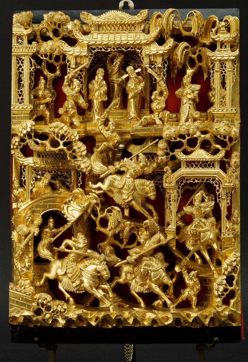 Coppia di pannelli in legno intagliato e dorato con figure di cavalieri, Cina, Dinastia Qing, XIX secolo