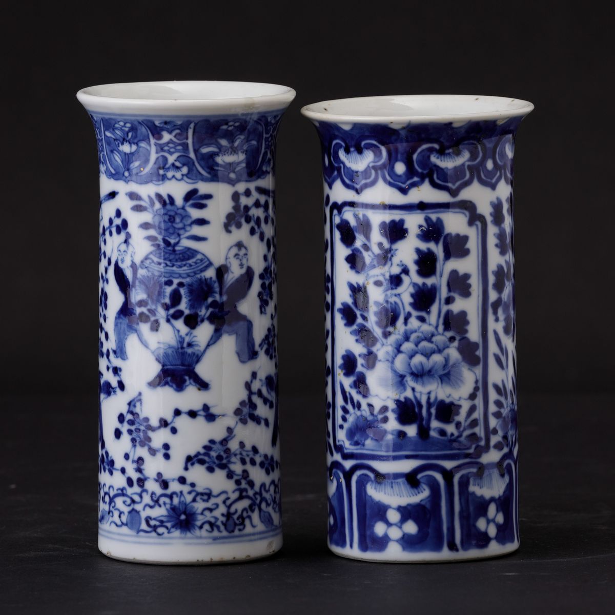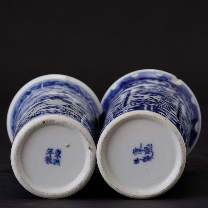 Coppia di vasi cilindrici in porcellana bianca e blu con decori floreali, Cina, Dinastia Qing, epoca Qianlong (1736-1796) [..]