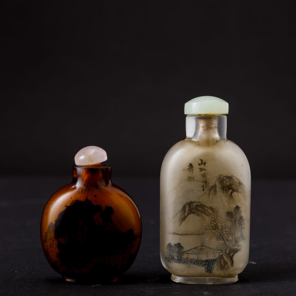 Due snuff bottles in vetro dipinto raffiguranti paesaggi con iscrizioni, Cina, Dinastia Qing, XIX secolo