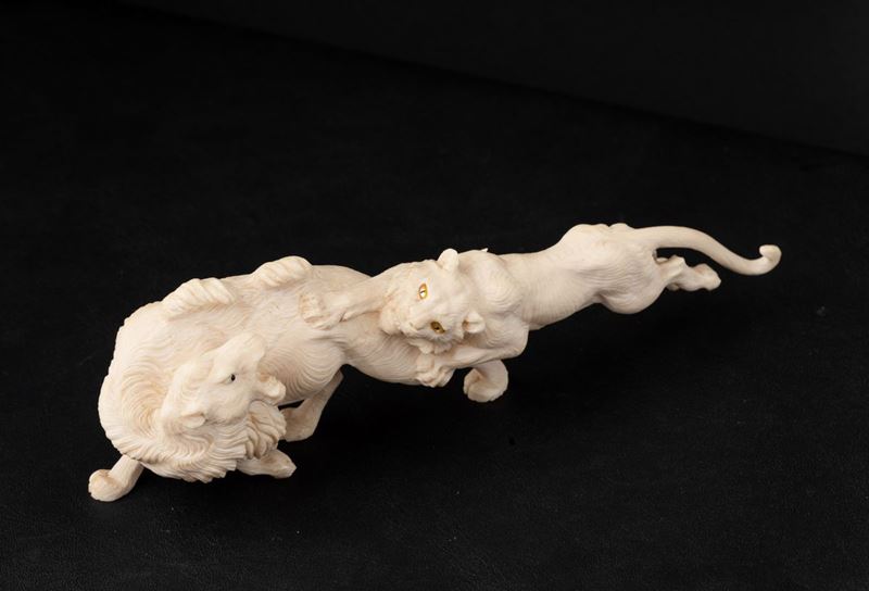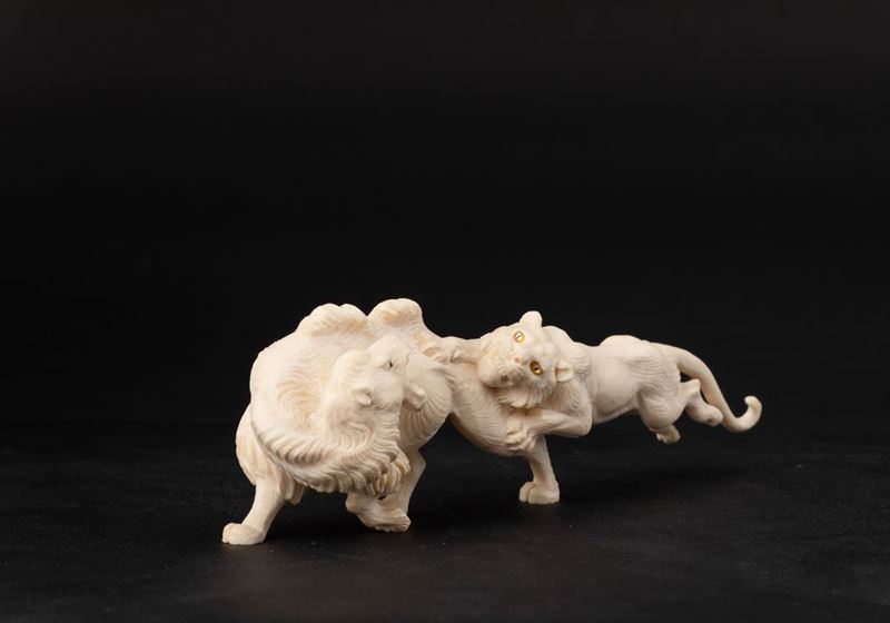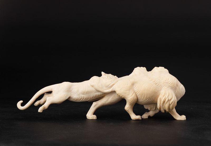 Gruppo scolpito in avorio raffigurante pantera che caccia un cammello, Cina, inizi XX secolo