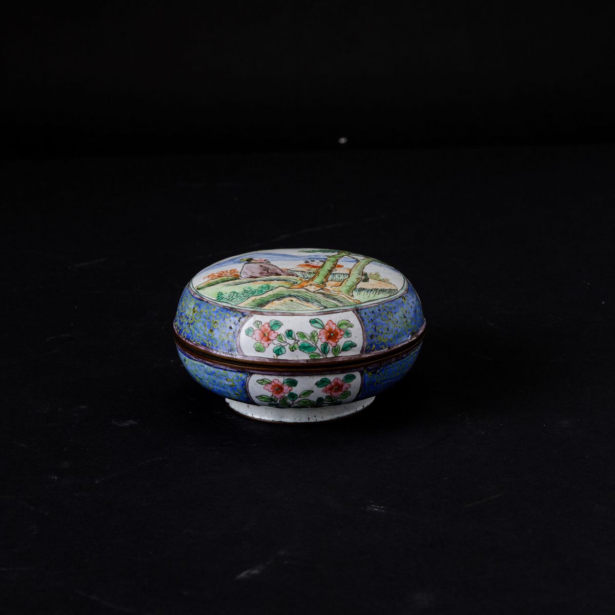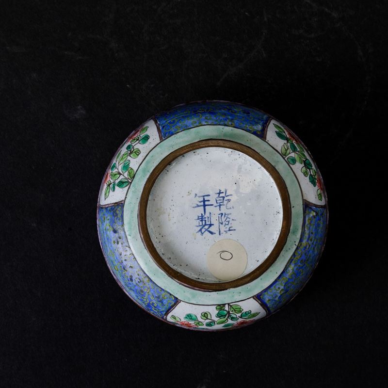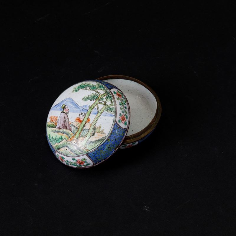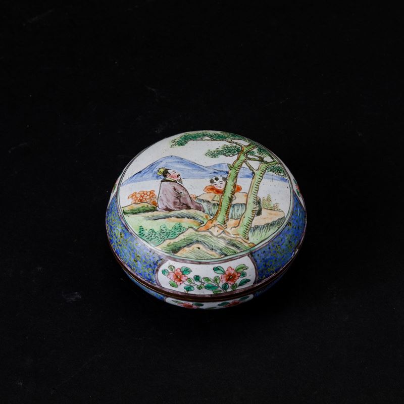 Scatola circolare con coperchio in smalti con raffigurazione di saggio e fanciullo e decori floreali entro riserve, Cina, Dinastia Qing, XIX secolo