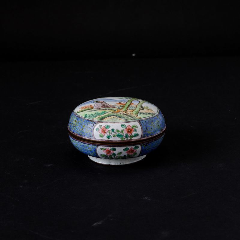 Scatola circolare con coperchio in smalti con raffigurazione di saggio e fanciullo e decori floreali entro riserve, Cina, [..]