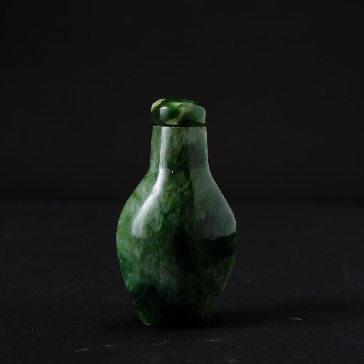 Snuff bottle scolpita in giada color spinacio, Cina, Dinastia Qing, XIX secolo