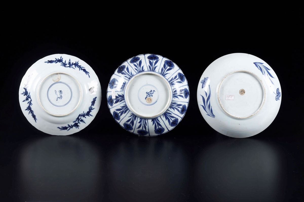 White and blue porcelain with nature and flower decorations. Kangxi period (1662-1722). Diameter from 21.5 to 22cm