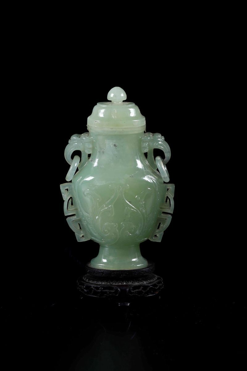 Vaso scolpito in giada Celadon con coperchio e anse ad anello, Cina, XX secolo