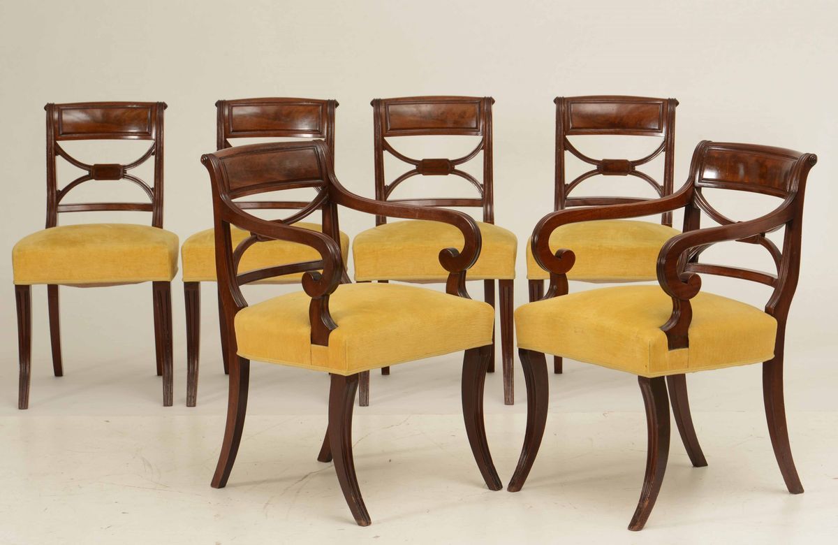 Tavolo, coppia di poltrone e quattro sedie in mogano, Inghilterra XIX secolo