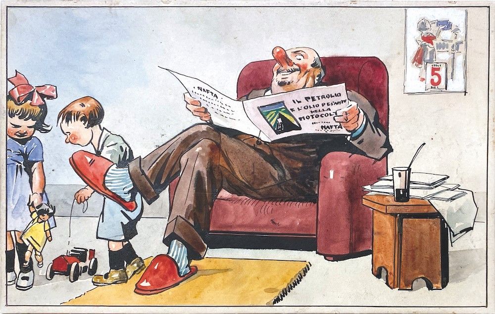 A promotional humouristic illustration, second half of the 1910s. Mixed technique on cardboard. 17x27cm. QUALITY: A-, minor marginal tears.