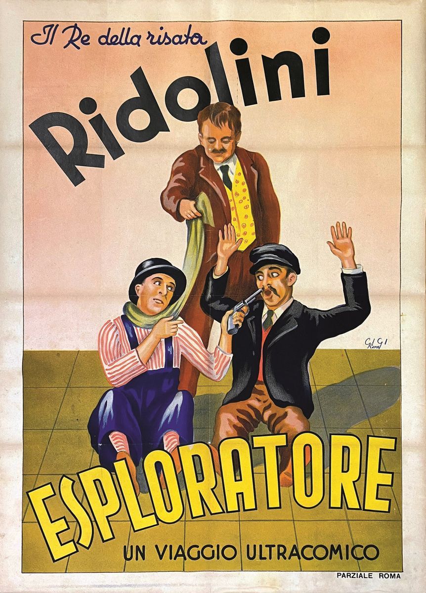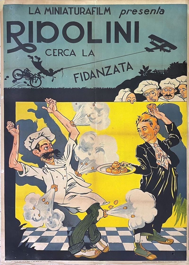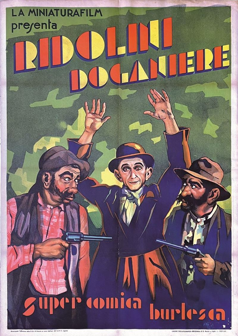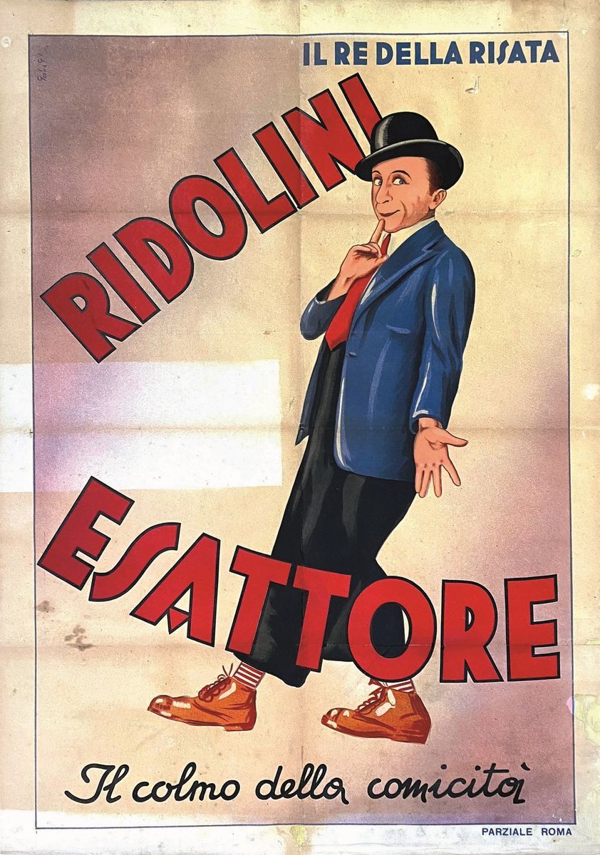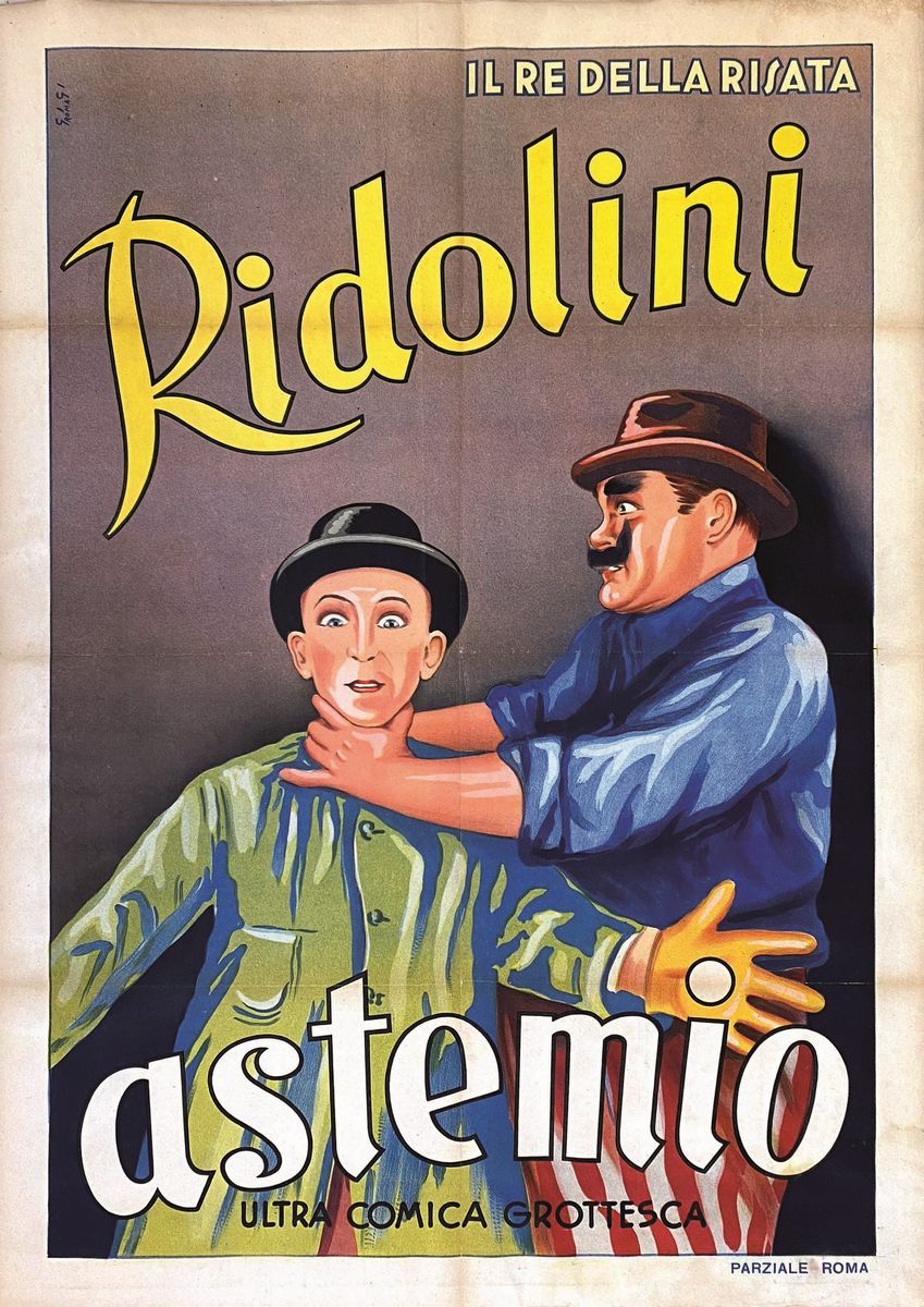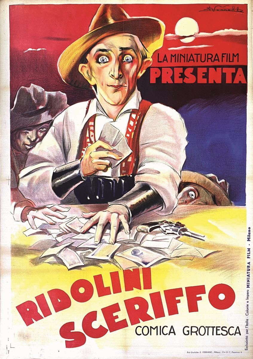 A collection of 24 lithographic posters, 100x70cm each. Printed by Arti Grafiche Milan, partly in Rome, Unione-tipolitografica bresciana, 1938/39, 1st edition. The collection belonged to renowned scholar Camillo Moscati and was published in the book “Ridolini”, Lo Vecchio, 1990. Mixed states of conservation, QUALITY: A-, B- and C. Linen-backed.