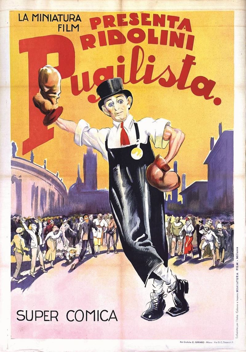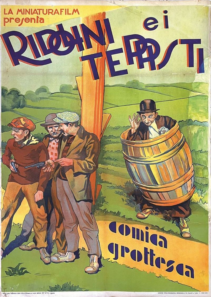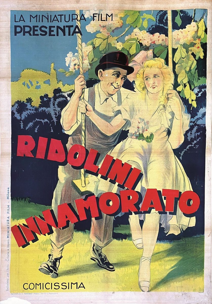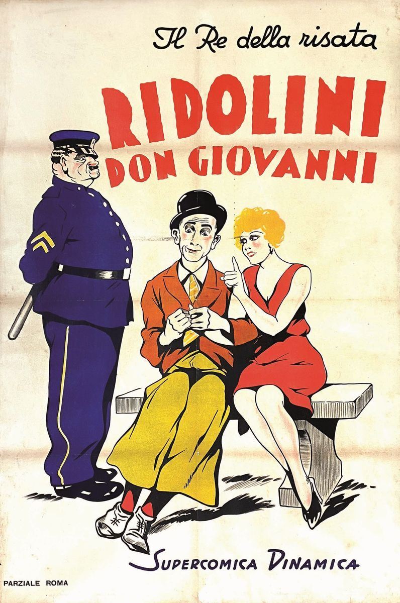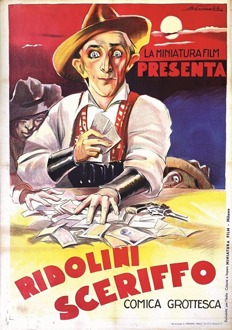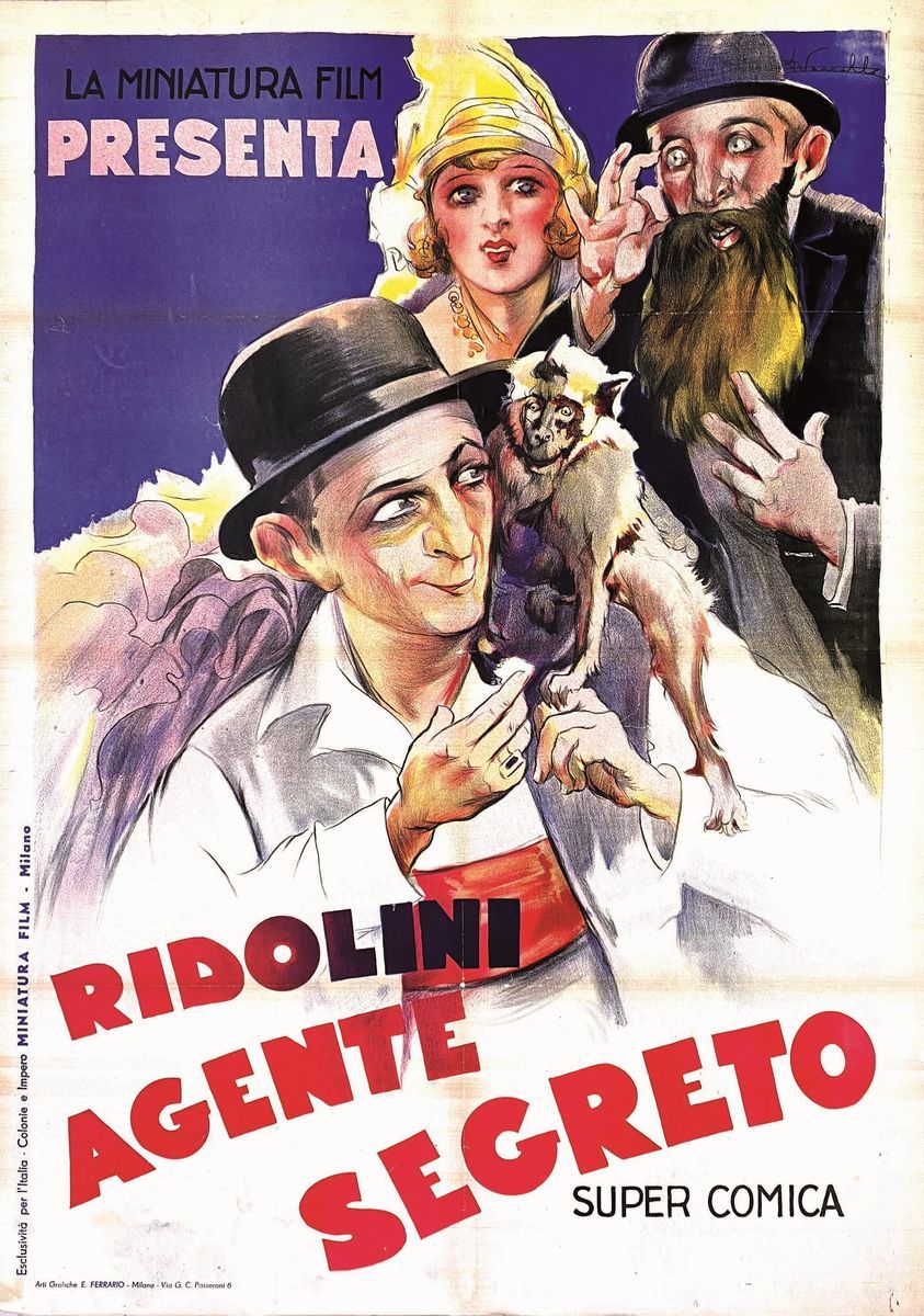 A collection of 24 lithographic posters, 100x70cm each. Printed by Arti Grafiche Milan, partly in Rome, Unione-tipolitografica bresciana, 1938/39, 1st edition. The collection belonged to renowned scholar Camillo Moscati and was published in the book “Ridolini”, Lo Vecchio, 1990. Mixed states of conservation, QUALITY: A-, B- and C. Linen-backed.