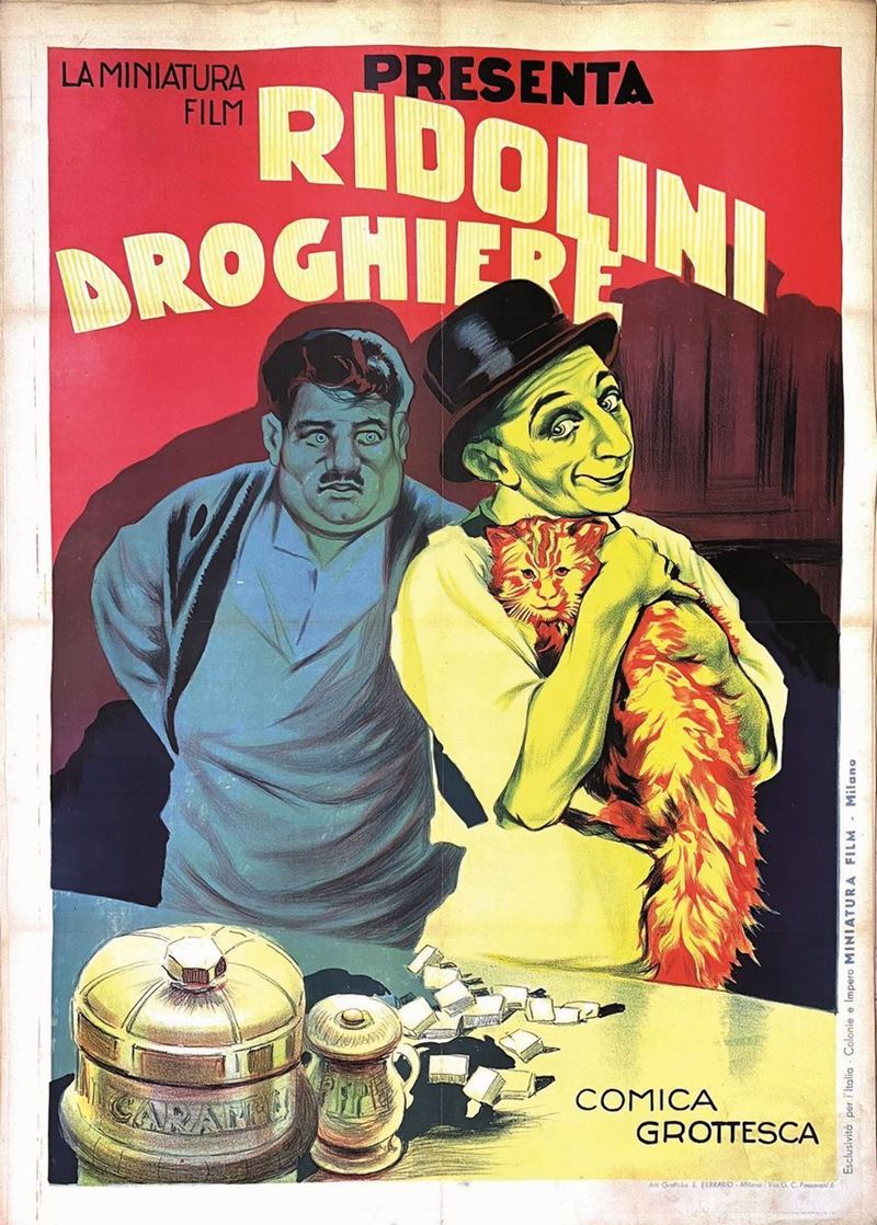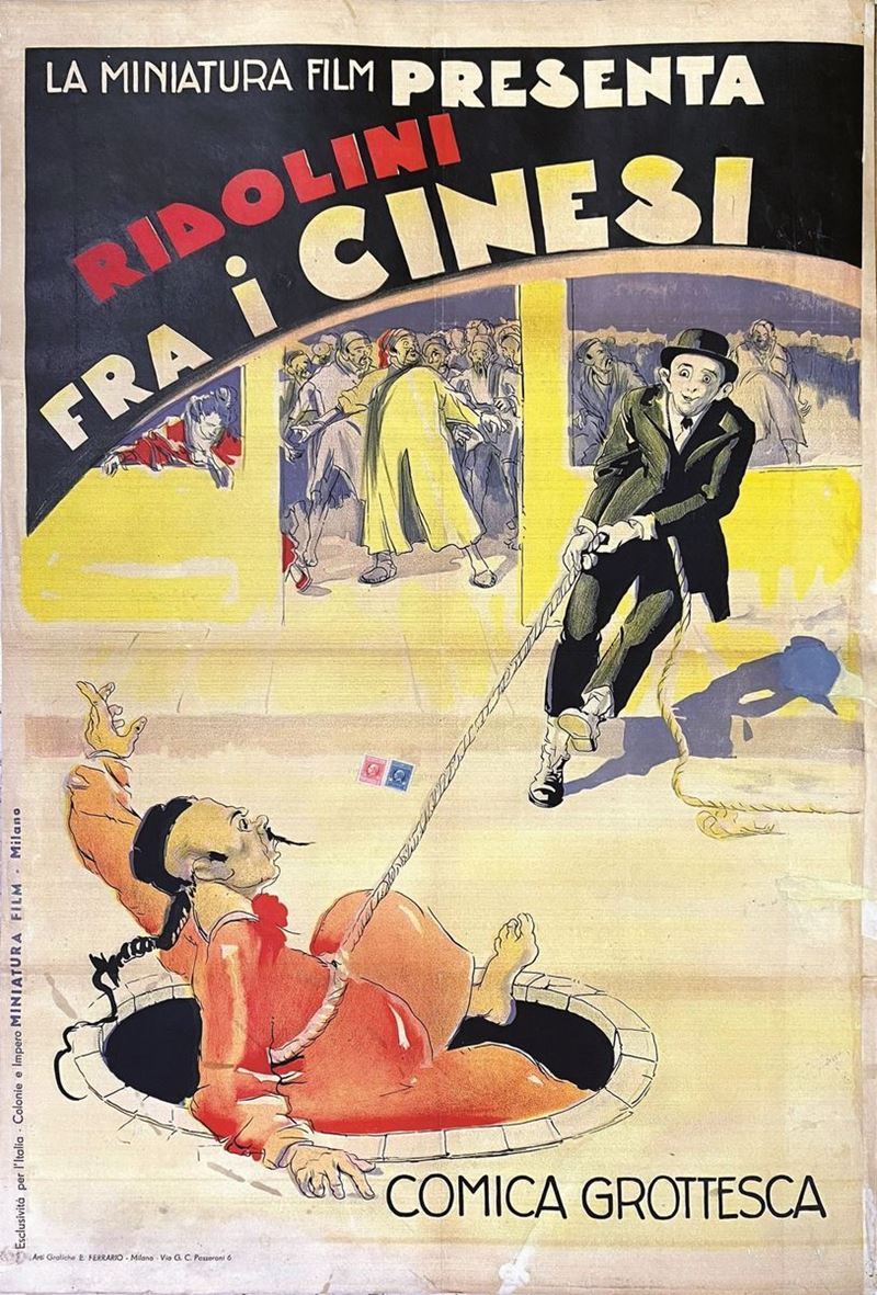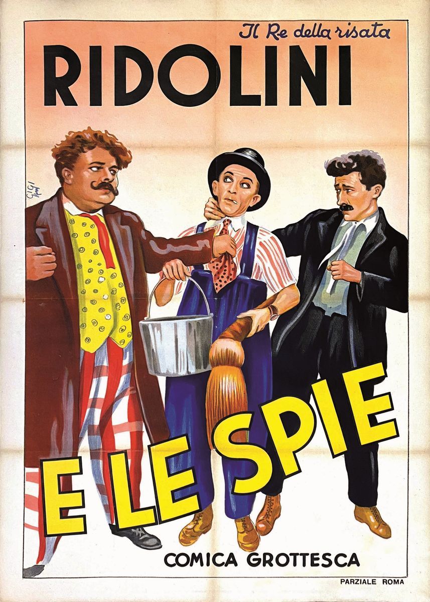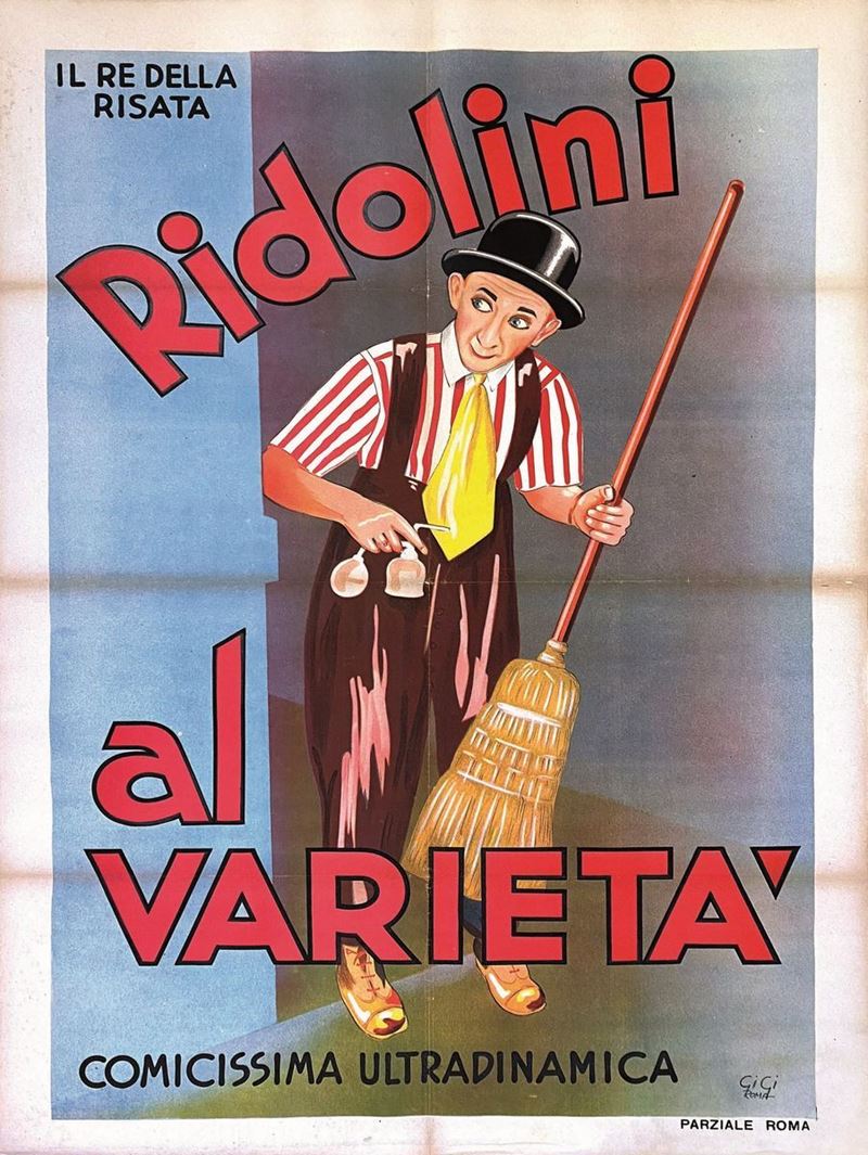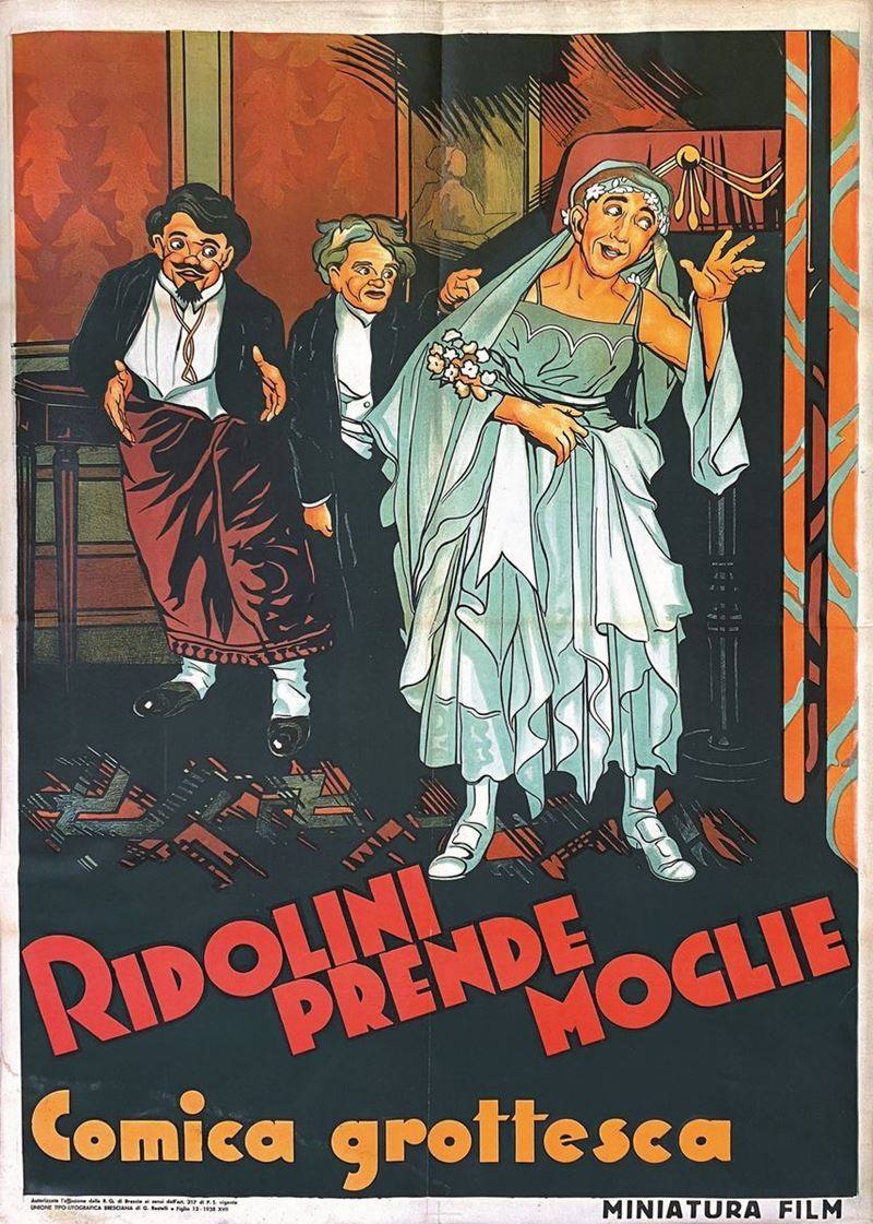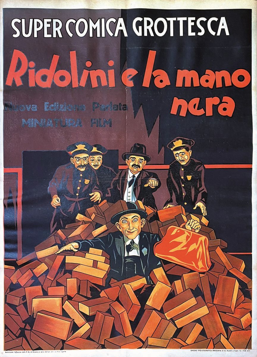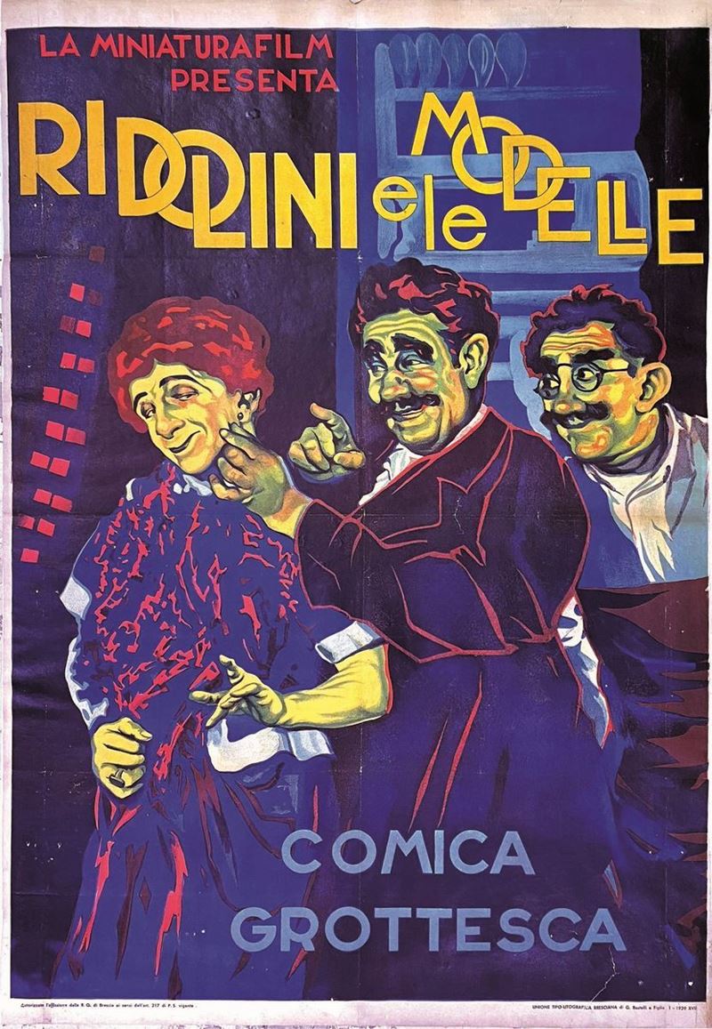 A collection of 24 lithographic posters, 100x70cm each. Printed by Arti Grafiche Milan, partly in Rome, Unione-tipolitografica bresciana, 1938/39, 1st edition. The collection belonged to renowned scholar Camillo Moscati and was published in the book “Ridolini”, Lo Vecchio, 1990. Mixed states of conservation, QUALITY: A-, B- and C. Linen-backed.