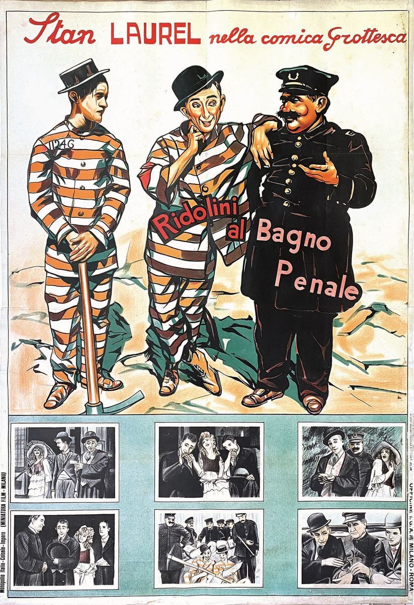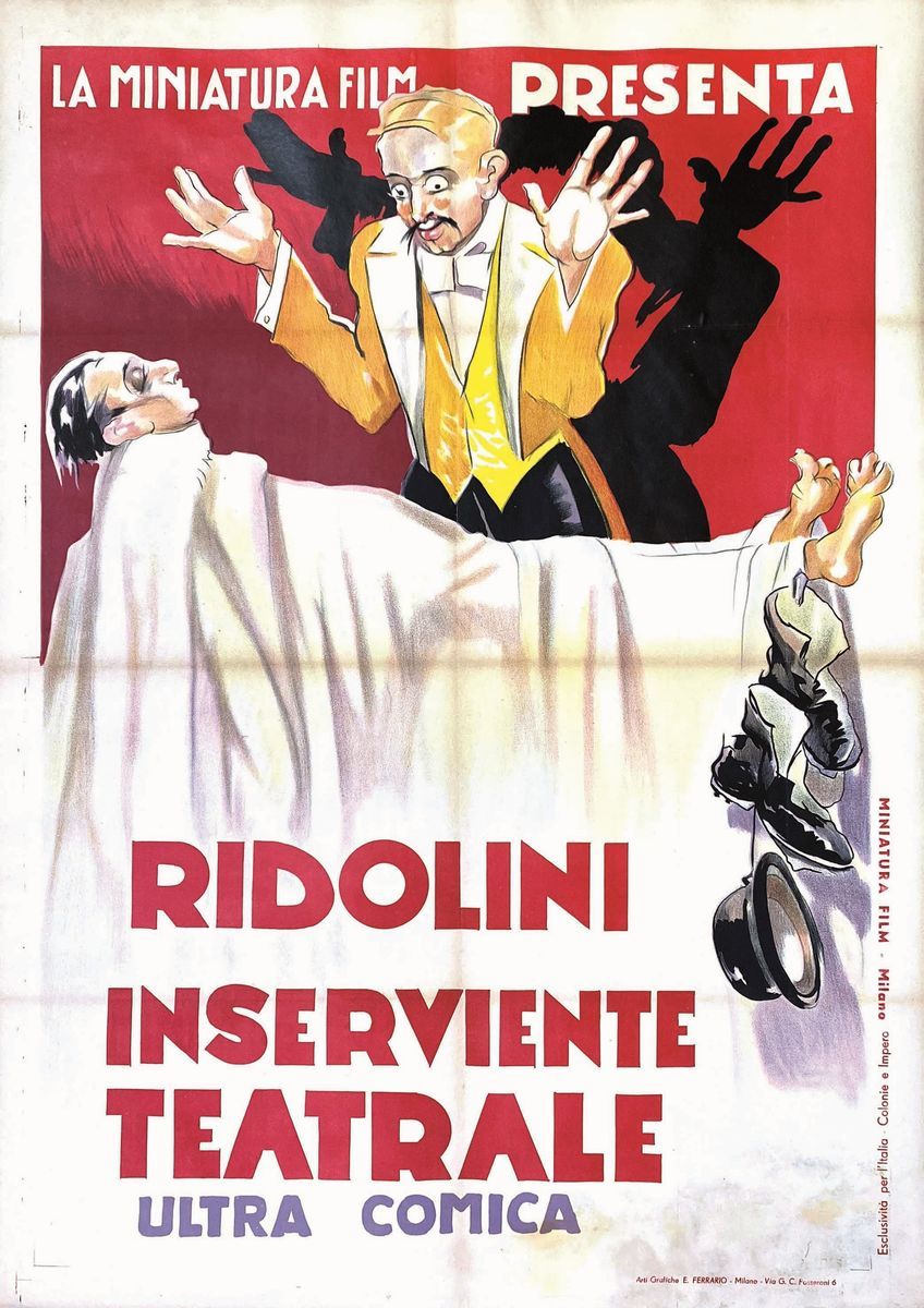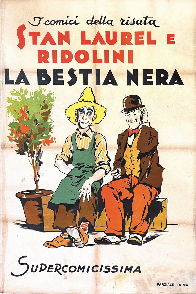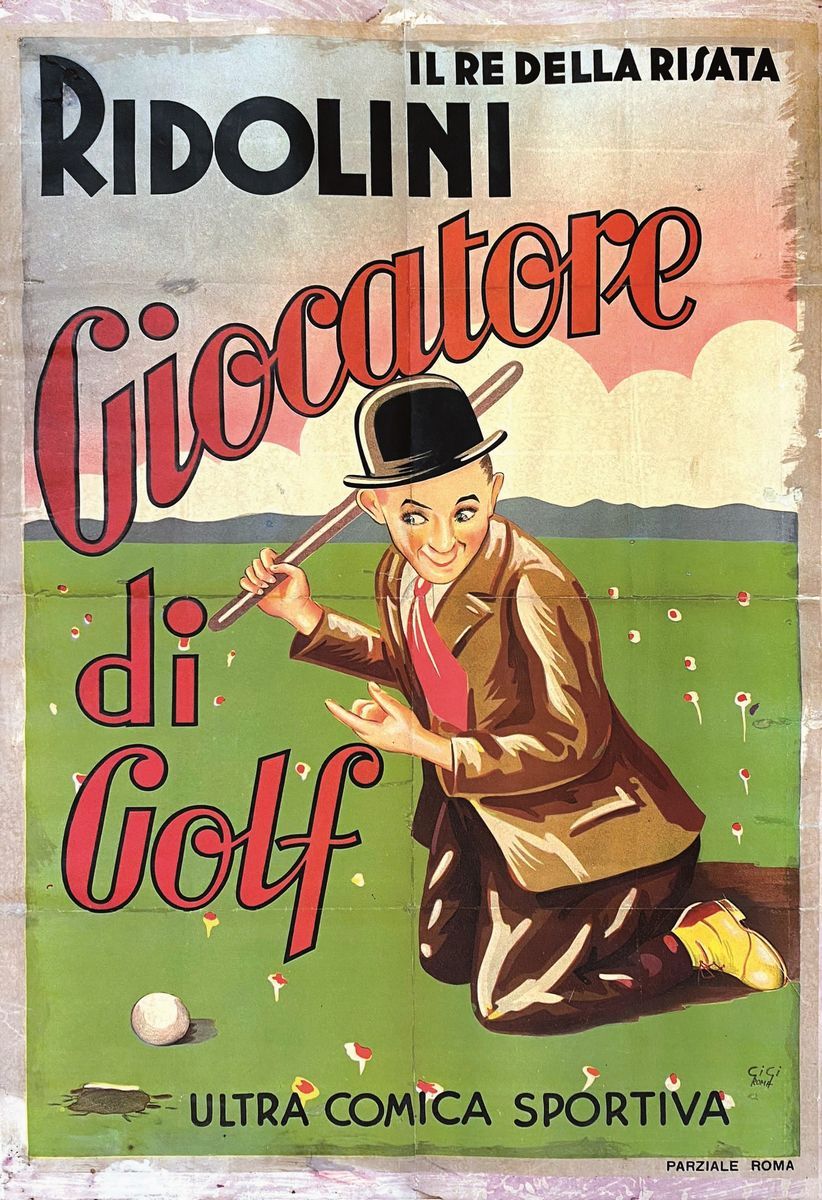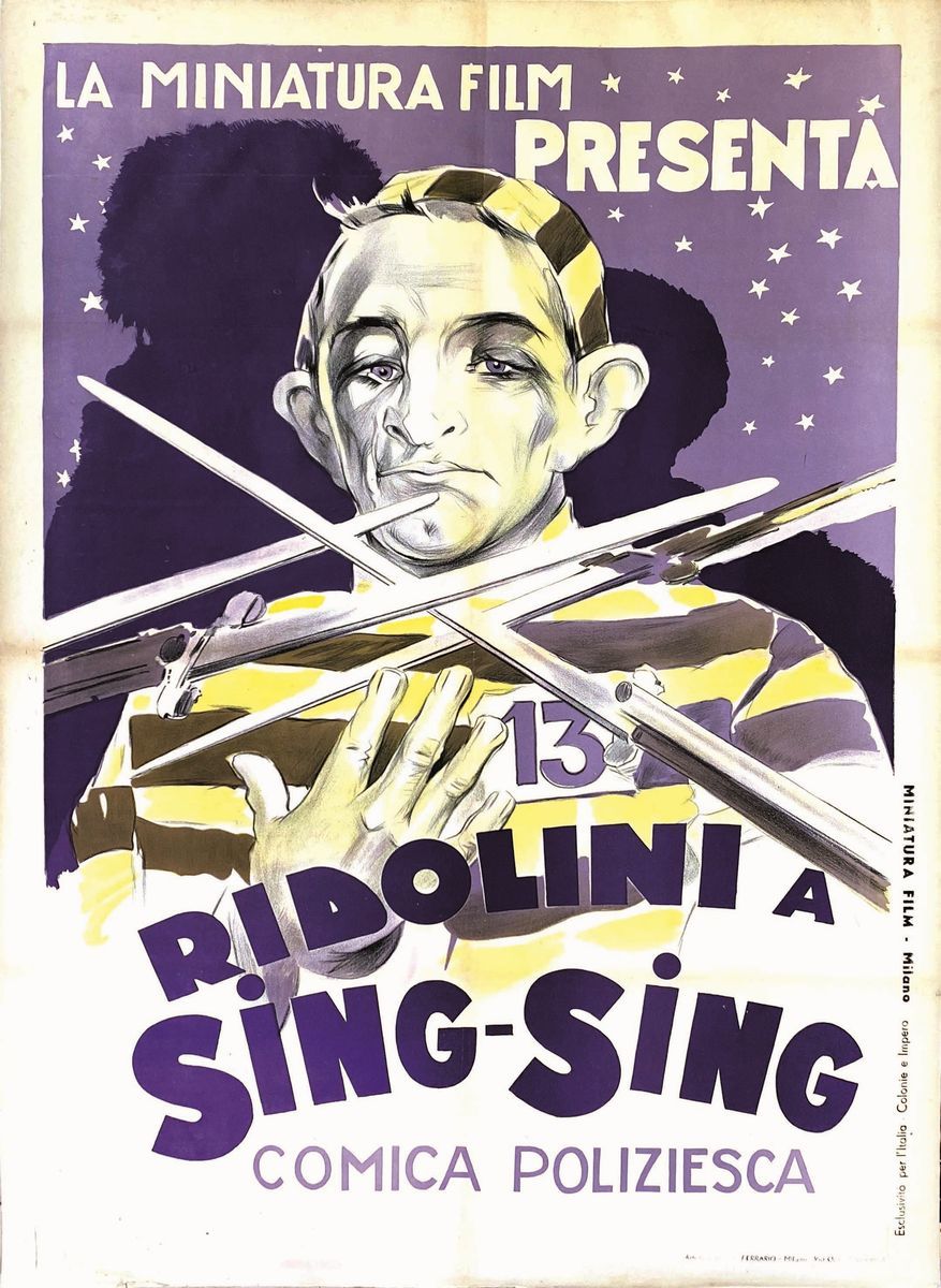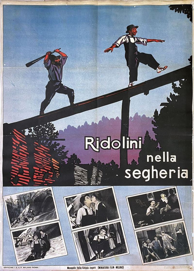A collection of 24 lithographic posters, 100x70cm each. Printed by Arti Grafiche Milan, partly in Rome, Unione-tipolitografica bresciana, 1938/39, 1st edition. The collection belonged to renowned scholar Camillo Moscati and was published in the book “Ridolini”, Lo Vecchio, 1990. Mixed states of conservation, QUALITY: A-, B- and C. Linen-backed.