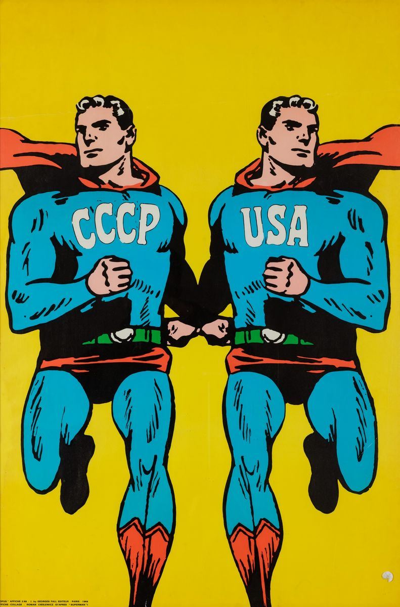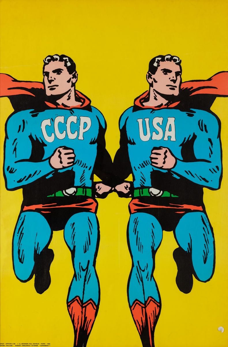 An offset poster with a double image of Superman portraying the USSR (CCCP / Soviet Union) and the USA. Cover of Opus Magazine in 1968. Published by Georges Fall, Paris, and printed by Serg, Paris. 83x56cm framed paper, QUALITY: A-.