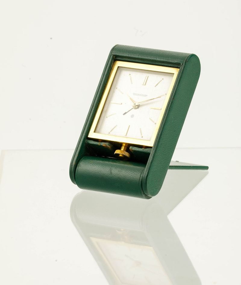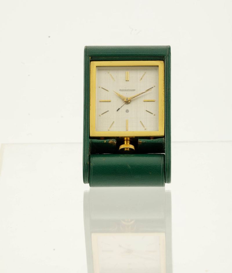 JAEGER LECOULTRE - Sveglietta da viaggio in metallo dorato 8 giorni di carica con rivestimento in pelle anni '60