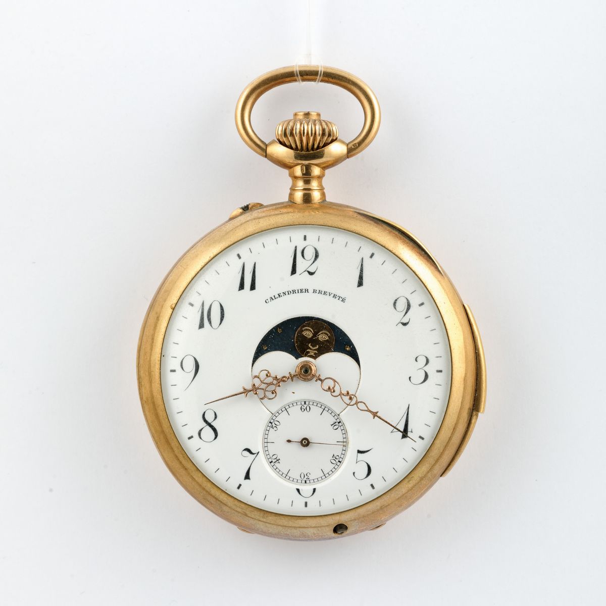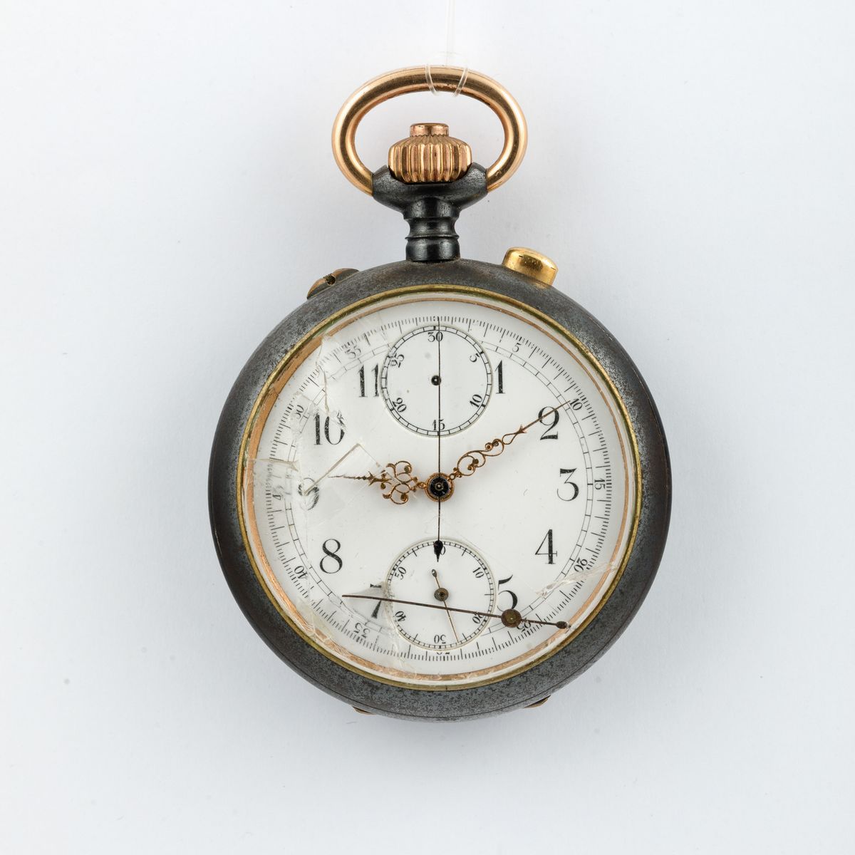 Un ripetizione minuti a slitta con calendario double face e fasi lunari in oro 18k Un cronografo in acciaio brunito con vetro rotto