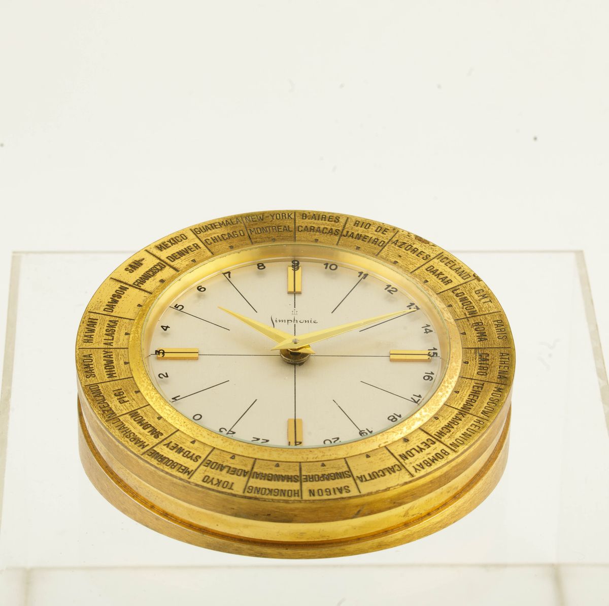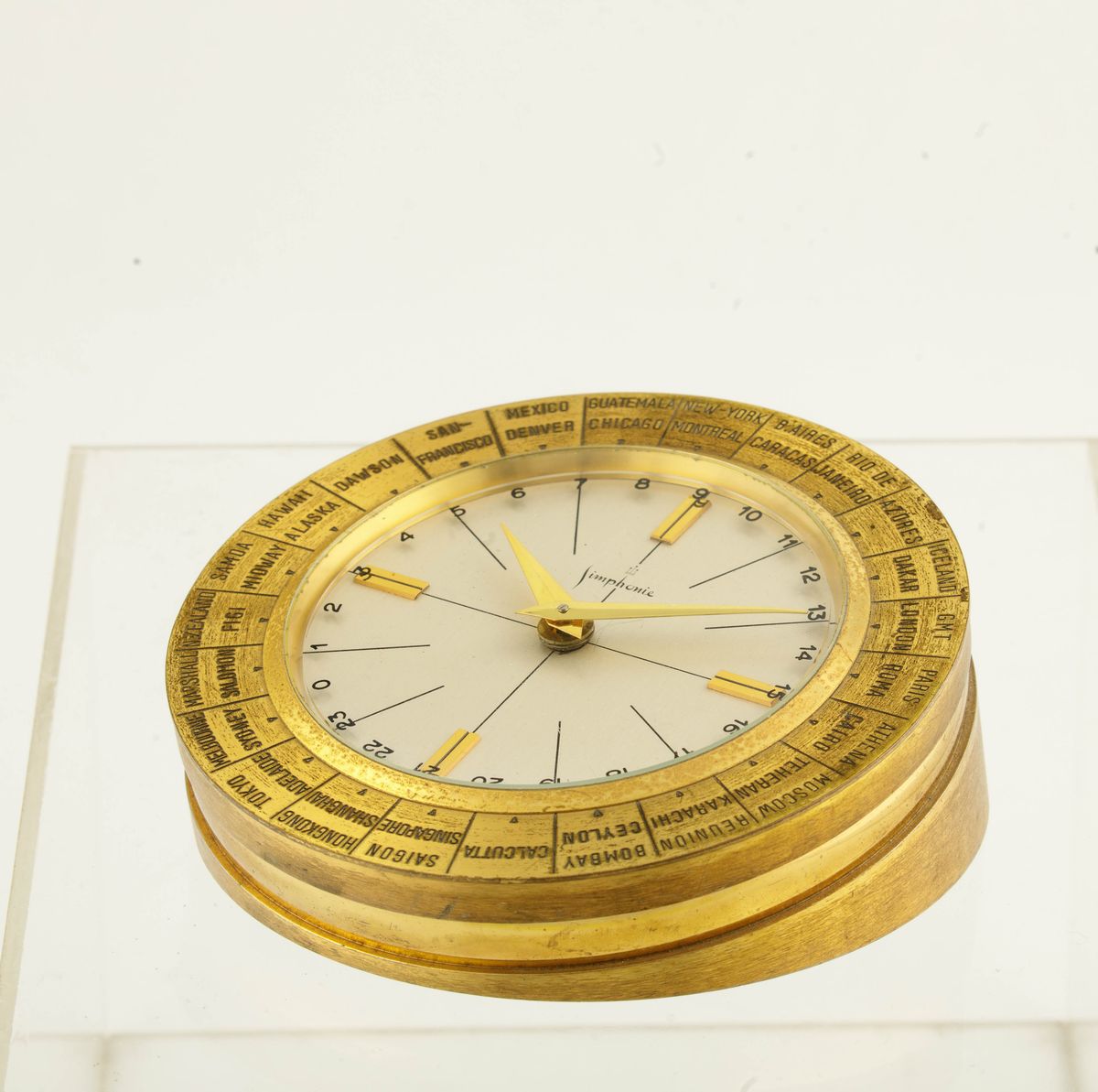 SIMPHONIE - Orologio da scrivania Ore del Mondo in ottone dorato, carica manuale con riserva di 8 giorni
