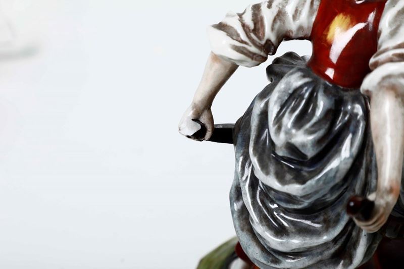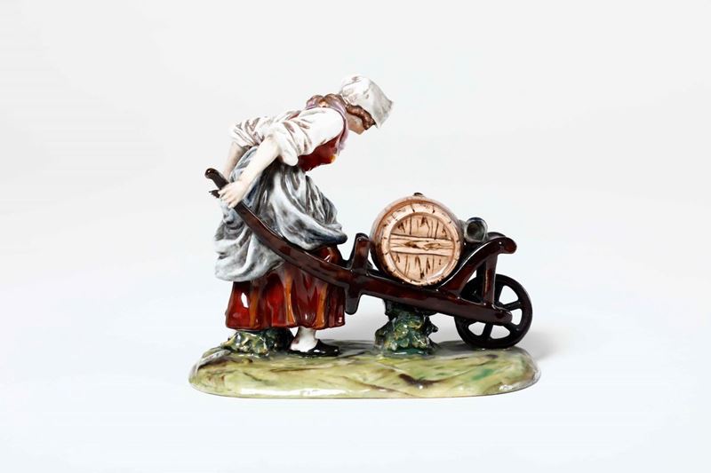 Porcellana. Marca: "N" coronata in blu. Altezza cm 15,4. Conservazione: mancanza all'estremità del manico della cariola