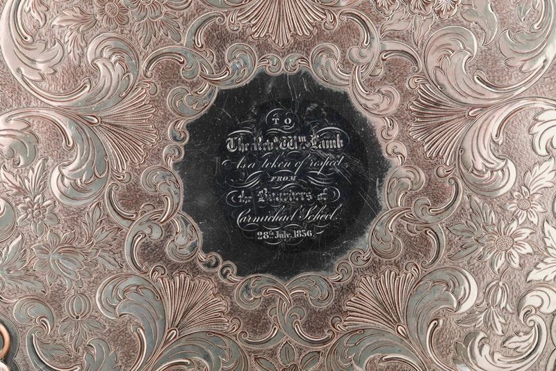 Grande salver in metallo inciso. Inghilterra, Londra, datato 1836