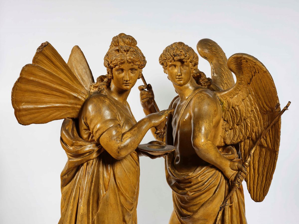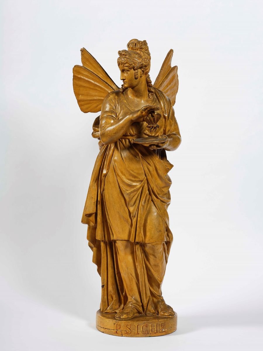 Le due raffinate sculture, rara testimonianza di elevata qualità esecutiva nella antica tecnica della modellazione della cartapesta, raffigurano il tema mitologico caro all’arte neoclassica, di Amore e Psiche, dove la fanciulla mette simbolicamente la sua anima, nelle sembianze di farfalla, nelle mani di Amore che appare intento a nascondere l’arco che con i suoi dardi è causa della travagliata vicenda amorosa. L’uso di un materiale leggero ed “effimero” come la cartapesta è legato alla funzione delle opere realizzate utilizzate fin dall’antichità in ricchi ed elaborati apparati scenici sacri o in festose coreografie profane in feste o cortei nel caso delle nostre create probabilmente per un convivio nuziale.