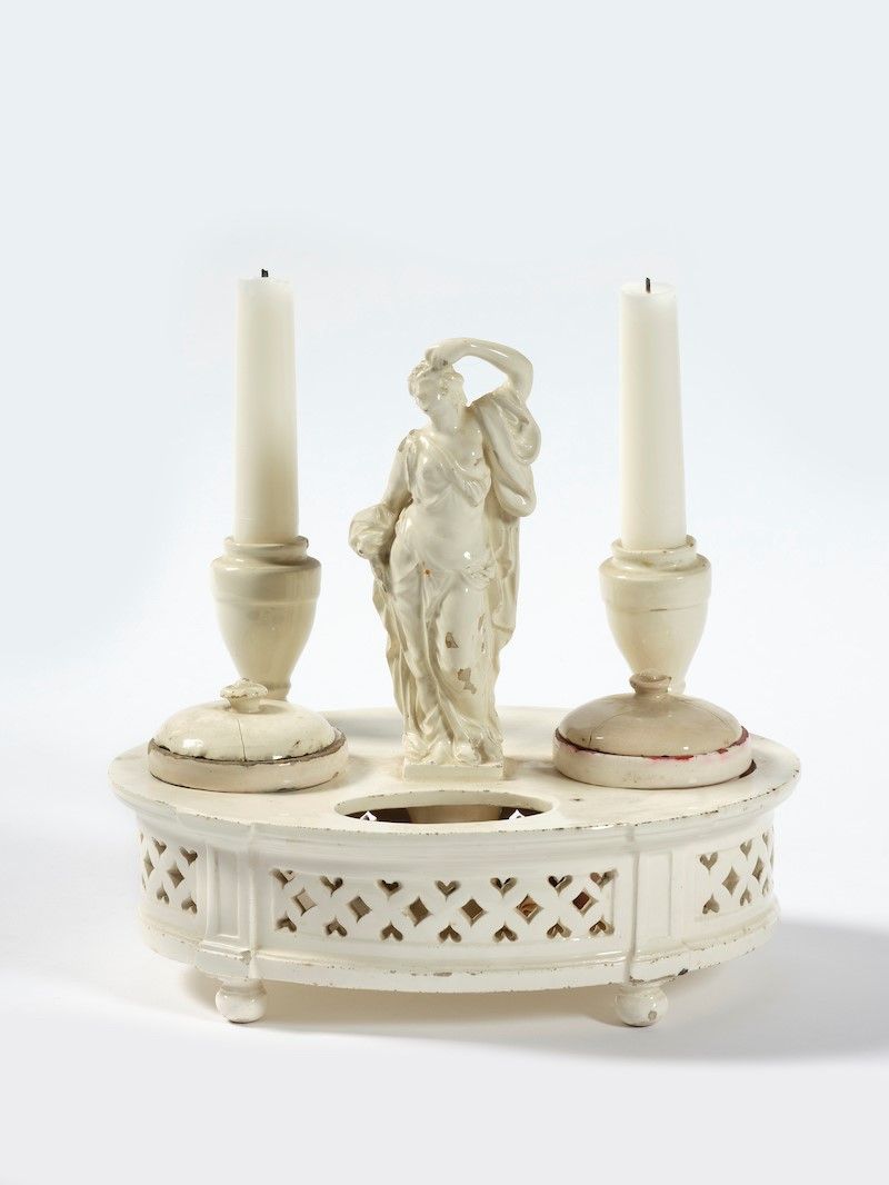 Calamaio da scrivania in stile neoclassico su base ellittica con parete traforata, vasetti con coperchio e, al centro, figura femminile in veste classica