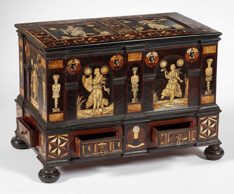 Cassetta monetiere. Varie essenze lignee, madreperla, osso. Ebanisteria d’oltralpe (Germania?) XVII secolo