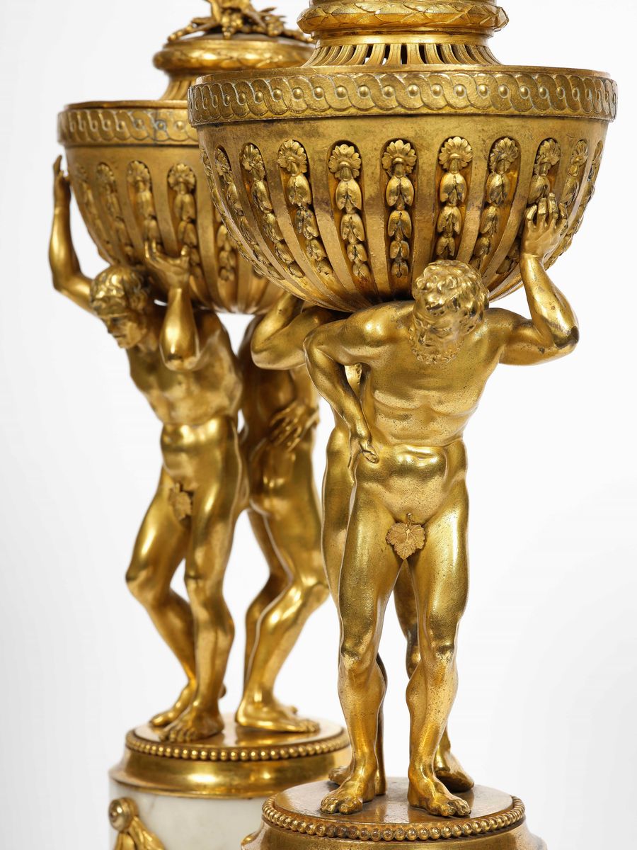 Coppia di brucia profumo in bronzo dorato e cesellato e marmo bianco. XIX secolo