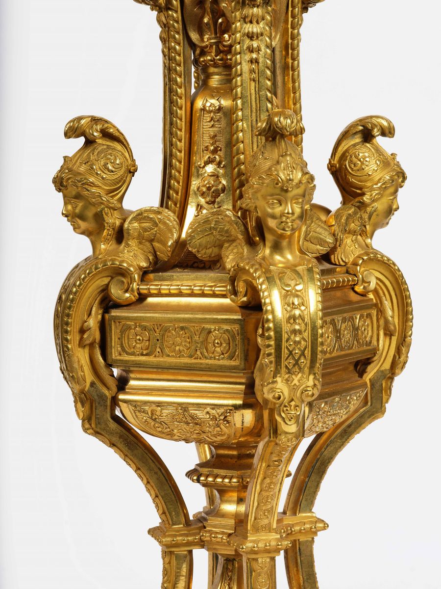 Coppia di candelabri a cinque fiamme in bronzo dorato e cesellato. XIX secolo